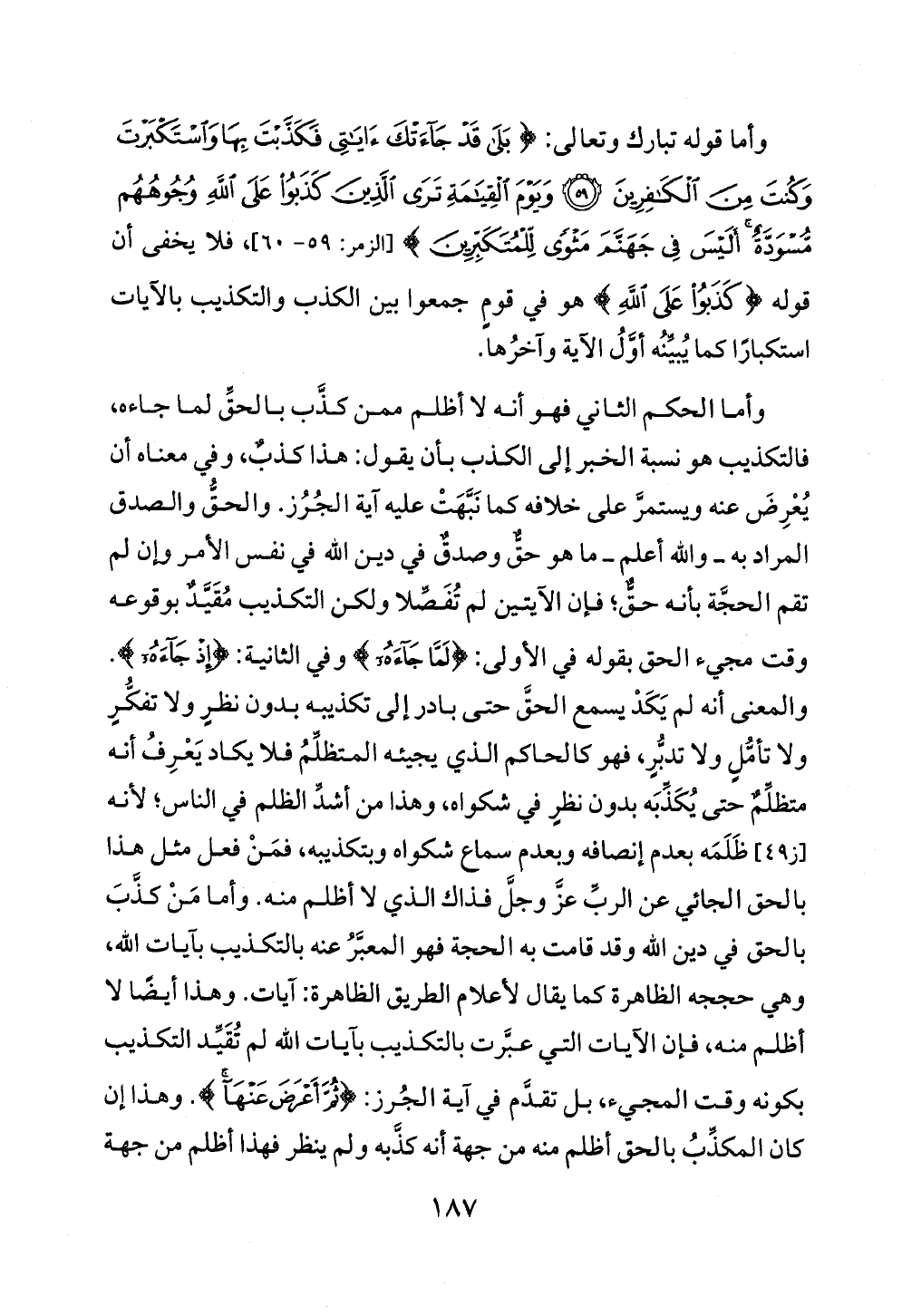 وأما الحكم الثاني فهو أنه لا أظلم ممن كذَّب بالحقِّ لما جاءه، فالتكذيب هو نسبة الخبر إلى الكذب بأن يقول: هذا كذبٌ، وفي معناه أن يُعْرِضَ عنه ويستمرَّ على خلافه كما نَبَّهَتْ عليه آية الجُرُز. والحقُّ والصدق المراد به ــ والله أعلم ــ ما هو حقٌّ وصدقٌ في دين الله في نفس الأمر وإن لم تقم الحجَّة بأنه حقٌّ؛ فإن الآيتين لم تُفَصِّلا ولكن التكذيب مُقَيَّدٌ بوقوعه وقت مجيء الحق بقوله في الأولى: {لَمَّا جَاءَهُ} وفي الثانية: {إِذْ جَاءَهُ}. والمعنى أنه لم يَكَدْ يسمع الحقَّ حتى بادر إلى تكذيبه بدون نظرٍ ولا تفكُّرٍ ولا تأمُّلٍ ولا تدبُّرٍ، فهو كالحاكم الذي يجيئه المتظلِّمُ فلا يكاد يَعْرِفُ أنه متظلِّمٌ حتى يُكَذِّبَه بدون نظرٍ في شكواه، وهذا من أشدِّ الظلم في الناس؛ لأنه [ز ٤٩] ظَلَمَه بعدم إنصافه وبعدم سماع شكواه وبتكذيبه، فمَنْ فعل مثل هذا بالحق الجائي عن الربِّ عزَّ وجلَّ فذاك الذي لا أظلم منه. وأما مَنْ كذَّبَ بالحق في دين الله وقد قامت به الحجة فهو المعبَّرُ عنه بالتكذيب بآيات الله، وهي حججه الظاهرة كما يقال لأعلام الطريق الظاهرة: آيات. وهذا أيضًا لا أظلم منه، فإن الآيات التي عبَّرت بالتكذيب بآيات الله لم تُقَيِّد التكذيب بكونه وقت المجيء، بل تقدَّم في آية الجُرز: {ثُمَّ أَعْرَضَ عَنْهَا}. وهذا إن كان المكذِّبُ بالحق أظلم منه من جهة أنه كذَّبه ولم ينظر فهذا أظلم من جهة