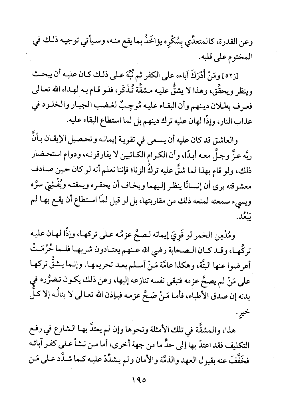ومُدْمِن الخمر لو قَوِيَ إيمانه لصحَّ عزمُه على تركها، وإذًا لهان عليه تركُها، وقد كان الصحابة رضي الله عنهم يعتادون شربها فلما حُرِّمَتْ أعرضوا عنها البتَّة، وهكذا عامَّة مَنْ أسلم بعد تحريمها. وإنما يشقُّ تركها على مَنْ لم يصحَّ عزمه فتبقى نفسه تنازعه إليها، وعن ذلك يكون تضرُّره في بدنه إن صدق الأطباء، فأما مَنْ صَحَّ عزمه فبإذن الله تعالى لا ينالُه إلا كلُّ خيرٍ.