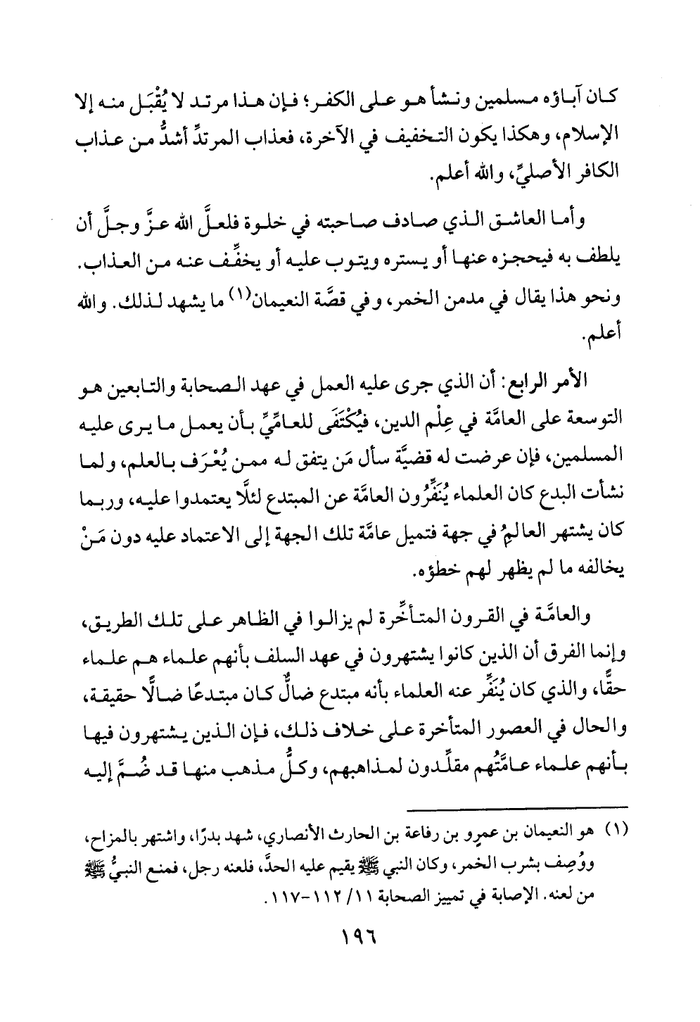 والعامَّة في القرون المتأخِّرة لم يزالوا في الظاهر على تلك الطريق، وإنما الفرق أن الذين كانوا يشتهرون في عهد السلف بأنهم علماء هم علماء حقًّا، والذي كان يُنَفِّر عنه العلماء بأنه مبتدع ضالٌّ كان مبتدعًا ضالًّا حقيقة، والحال في العصور المتأخرة على خلاف ذلك، فإن الذين يشتهرون فيها بأنهم علماء عامَّتُهم مقلِّدون لمذاهبهم، وكلُّ مذهب منها قد ضُمَّ إليه