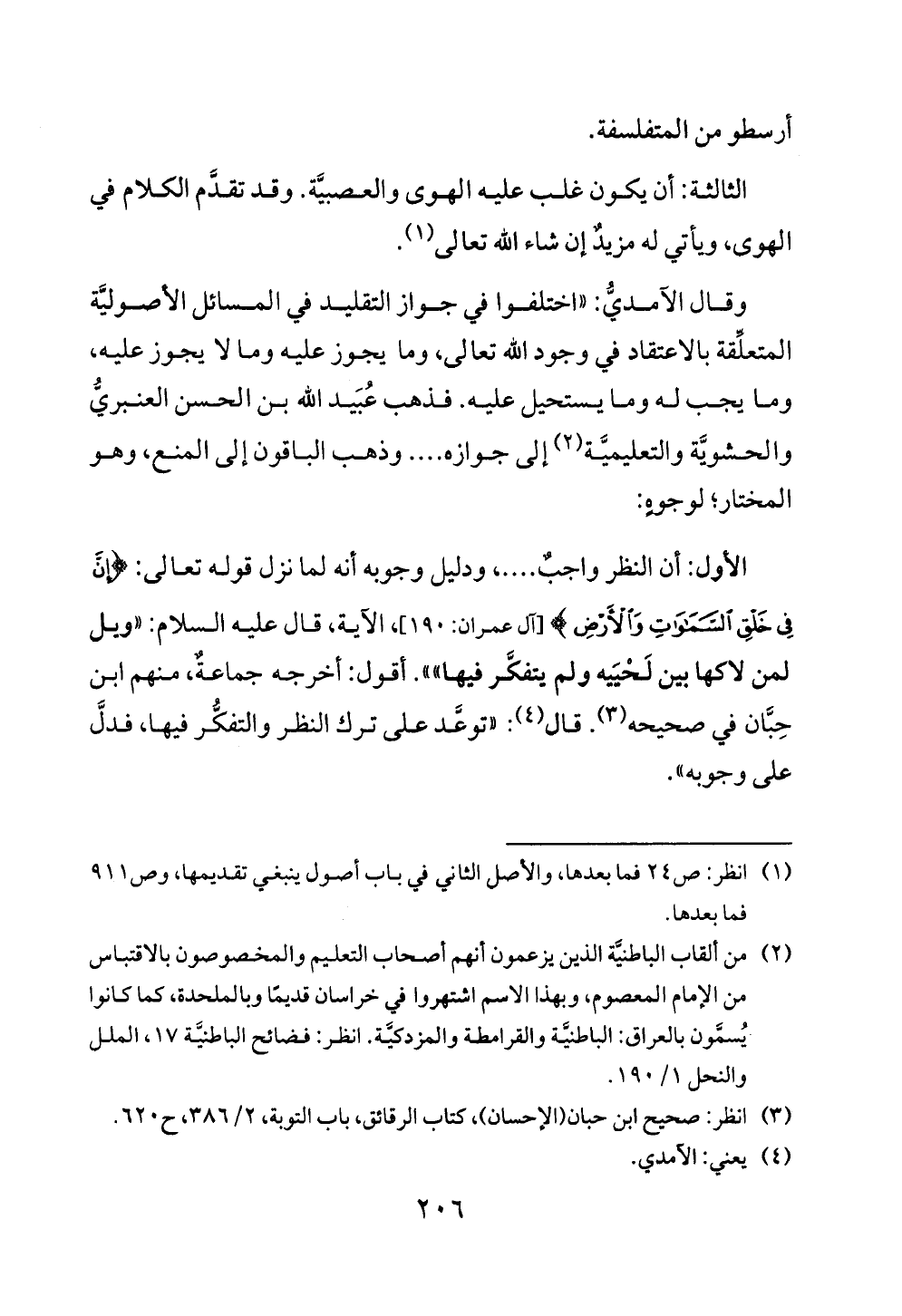 وقال الآمديُّ: «اختلفوا في جواز التقليد في المسائل الأصوليَّة المتعلِّقة بالاعتقاد في وجود الله تعالى، وما يجوز عليه وما لا يجوز عليه، وما يجب له وما يستحيل عليه. فذهب عُبَيد الله بن الحسن العنبريُّ والحشويَّة والتعليميَّة (¬٢) إلى جوازه .... وذهب الباقون إلى المنع، وهو المختار؛ لوجوهٍ: