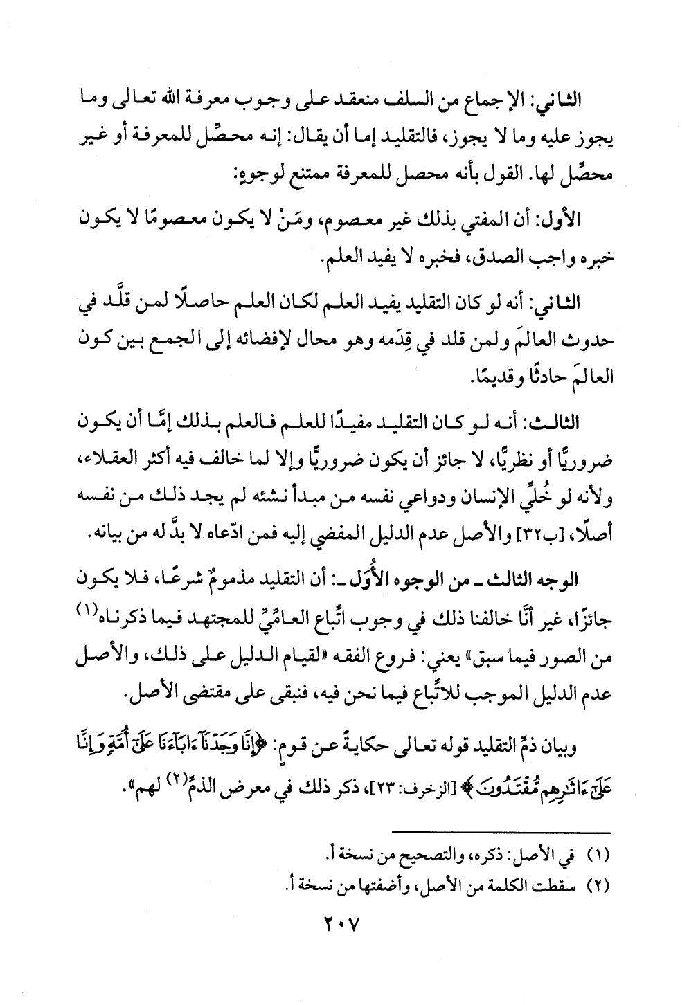 وبيان ذمِّ التقليد قوله تعالى حكايةً عن قومٍ: {إِنَّا وَجَدْنَا آبَاءَنَا عَلَى أُمَّةٍ وَإِنَّا عَلَى آثَارِهِمْ مُقْتَدُونَ} [الزخرف: ٢٣]، ذكر ذلك في معرض الذمِّ (¬٢) لهم».