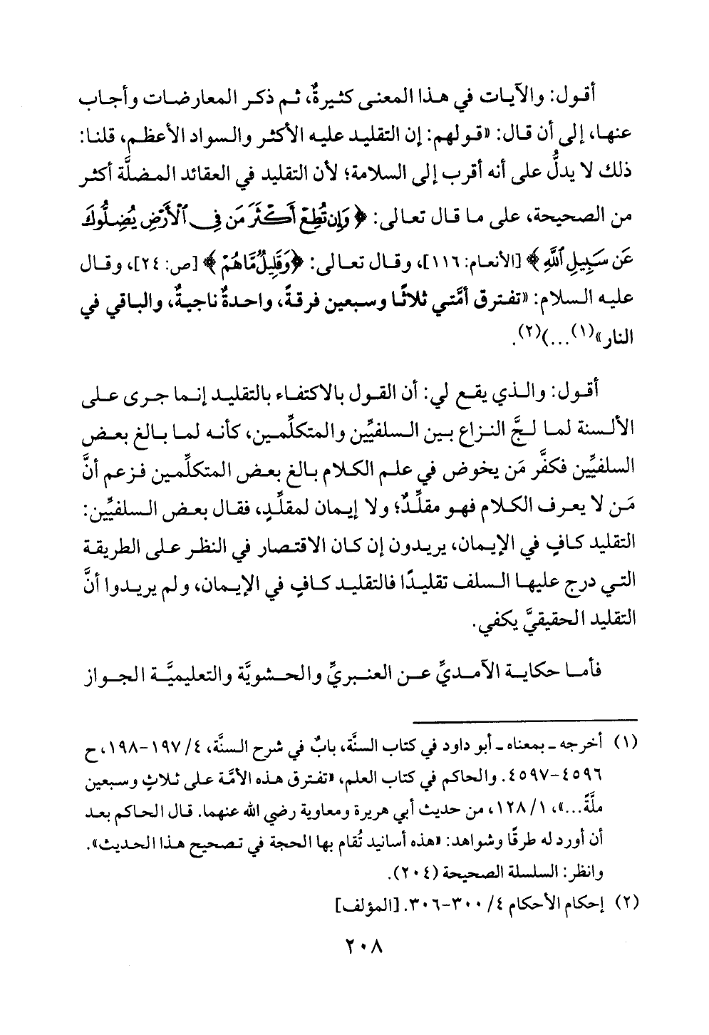 أقول: والآيات في هذا المعنى كثيرةٌ، ثم ذكر المعارضات وأجاب عنها، إلى أن قال: «قولهم: إن التقليد عليه الأكثر والسواد الأعظم، قلنا: ذلك لا يدلُّ على أنه أقرب إلى السلامة؛ لأن التقليد في العقائد المضلَّة أكثر من الصحيحة، على ما قال تعالى: {وَإِنْ تُطِعْ أَكْثَرَ مَنْ فِي الْأَرْضِ يُضِلُّوكَ عَنْ سَبِيلِ اللَّهِ} [الأنعام: ١١٦]، وقال تعالى: {وَقَلِيلٌ مَا هُمْ} [ص: ٢٤]، وقال عليه السلام: «تفترق أمَّتي ثلاثًا وسبعين فرقةً، واحدةٌ ناجيةٌ، والباقي في النار» (¬١) ... ) (¬٢).