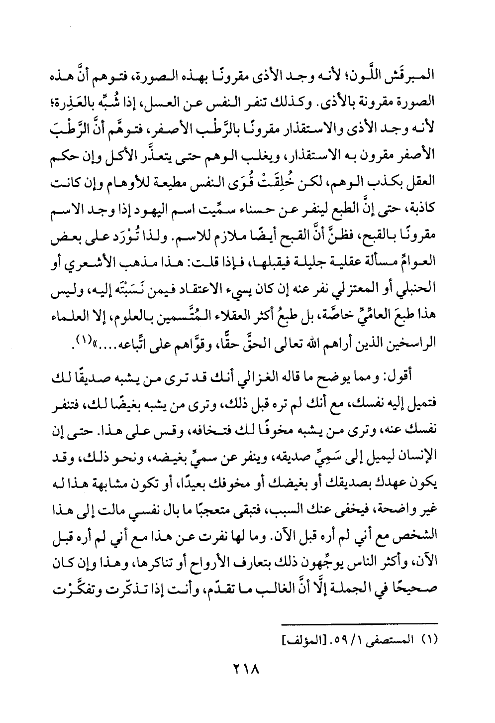 المبرقَش اللَّون؛ لأنه وجد الأذى مقرونًا بهذه الصورة، فتوهم أنَّ هذه الصورة مقرونة بالأذى. وكذلك تنفر النفس عن العسل، إذا شُبِّه بالعَذِرة؛ لأنه وجد الأذى والاستقذار مقرونًا بالرَّطْب الأصفر، فتوهَّم أنَّ الرَّطْبَ الأصفر مقرون به الاستقذار، ويغلب الوهم حتى يتعذَّر الأكل وإن حكم العقل بكذب الوهم، لكن خُلِقَتْ قُوَى النفس مطيعة للأوهام وإن كانت كاذبة، حتى إنَّ الطبع لينفر عن حسناء سمِّيت اسم اليهود إذا وجد الاسم مقرونًا بالقبح، فظنَّ أنَّ القبح أيضًا ملازم للاسم. ولذا تُوْرَد على بعض العوامِّ مسألة عقلية جليلة فيقبلها، فإذا قلت: هذا مذهب الأشعري أو الحنبلي أو المعتزلي نفر عنه إن كان يسيء الاعتقاد فيمن نَسَبْتَه إليه، وليس هذا طبعَ العامِّيِّ خاصَّة، بل طبعُ أكثر العقلاء المُتَّسمين بالعلوم، إلا العلماء الراسخين الذين أراهم الله تعالى الحقَّ حقًّا، وقوَّاهم على اتِّباعه .... » (¬١).