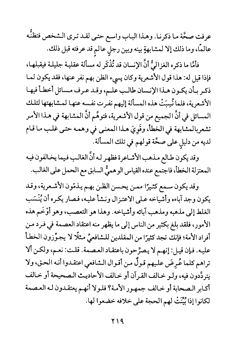 وقد يكون سمع كثيرًا ممن يحسن الظن بهم يذمّون الأشعرية، وقد يكون وجد آباءه وأشياخه على الاعتزال ونشأ عليه، فصار يكره أن يُنْسَب الغلط إلى مذهبه ومذهب آبائه وأشياخه. وهذا هو التعصب، وهو أوْخَم هذه الأمور، فلقد بلغ بكثير من الناس إلى ما يظهر منه اعتقاد العصمة في فرد من أفراد الأمة؛ فإنك تجد كثيرًا من المقلدين للشافعيِّ مثلًا لا يجوِّزون الخطأ عليه. فإن قيل: إنهم لا يصرِّحون باعتقاد العصمة. قلت: نعم، ولكن ألا تراهم كلما عُرِضَ عليهم قولٌ من أقوال الشافعي اعتقدوا أنه الحق، ولا يتردَّدون فيه، ولو خالف القرآن أو خالف الأحاديث الصحيحة أو خالف أكابر الصحابة أو خالف جمهور الأمة؟ فلولا أنهم يعتقدون له العصمة لكانوا إذا بُيِّنَتْ لهم الحجة على خلافه خضعوا لها.
