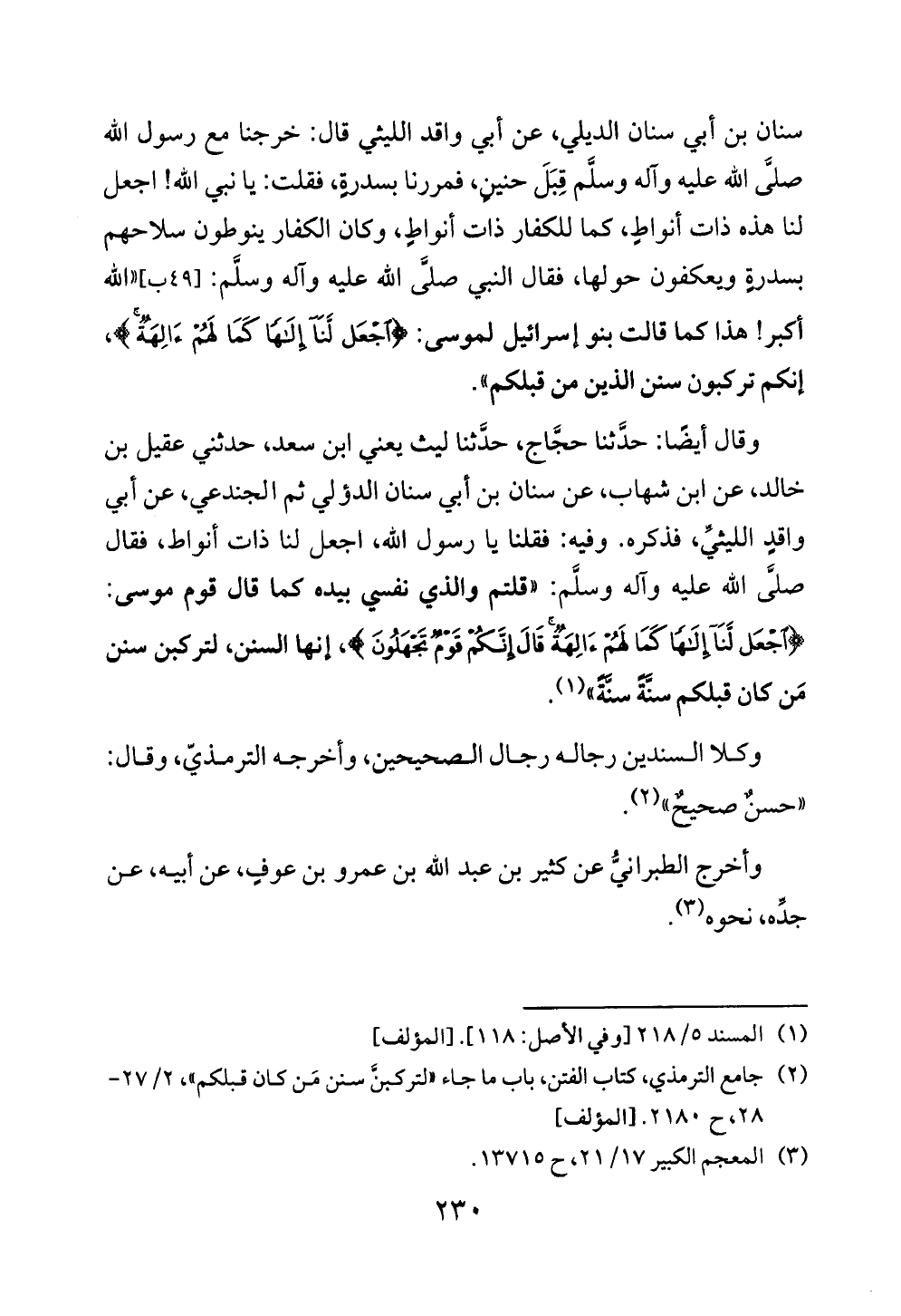 سنان بن أبي سنان الديلي، عن أبي واقد الليثي قال: خرجنا مع رسول الله صلَّى الله عليه وآله وسلَّم قِبَلَ حنينٍ، فمررنا بسدرةٍ، فقلت: يا نبي الله! اجعل لنا هذه ذات أنواطٍ، كما للكفار ذات أنواطٍ، وكان الكفار ينوطون سلاحهم بسدرةٍ ويعكفون حولها، فقال النبي صلَّى الله عليه وآله وسلَّم: [٤٩ ب] «الله أكبر! هذا كما قالت بنو إسرائيل لموسى: {اجْعَلْ لَنَا إِلَهًا كَمَا لَهُمْ آلِهَةٌ}، إنكم تركبون سنن الذين من قبلكم».