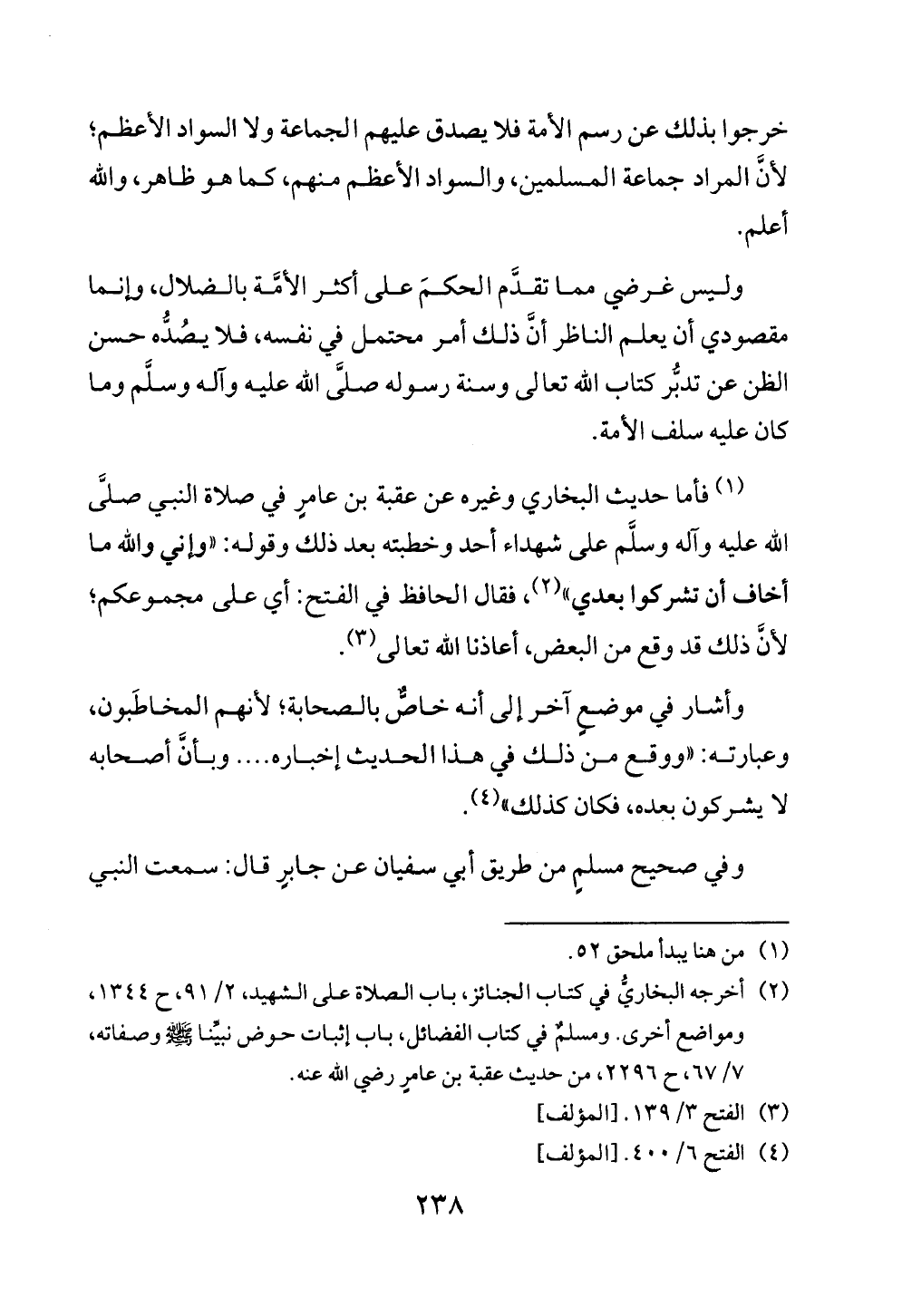 وليس غرضي مما تقدَّم الحكمَ على أكثر الأمَّة بالضلال، وإنما مقصودي أن يعلم الناظر أنَّ ذلك أمر محتمل في نفسه، فلا يصُدُّه حسن الظن عن تدبُّر كتاب الله تعالى وسنة رسوله صلَّى الله عليه وآله وسلَّم وما كان عليه سلف الأمة. (¬١) فأما حديث البخاري وغيره عن عقبة بن عامرٍ في صلاة النبي صلَّى الله عليه وآله وسلَّم على شهداء أحد وخطبته بعد ذلك وقوله: «وإني والله ما أخاف أن تشركوا بعدي» (¬٢)، فقال الحافظ في الفتح: أي على مجموعكم؛ لأنَّ ذلك قد وقع من البعض، أعاذنا الله تعالى (¬٣).