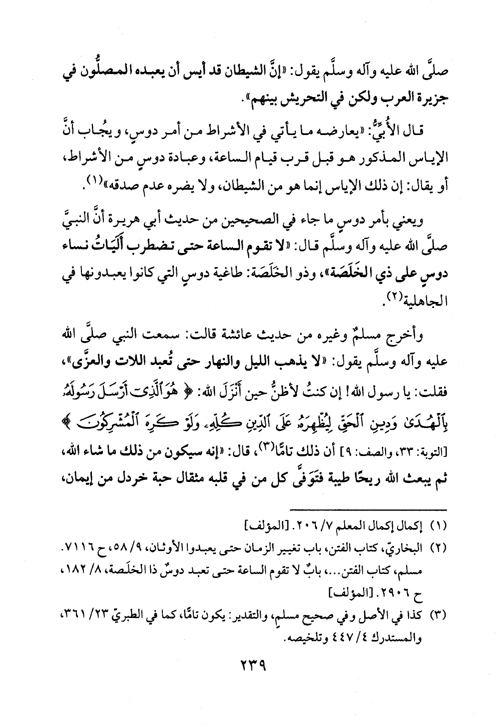 (¬٢) البخاريّ، كتاب الفتن، باب تغيير الزمان حتى يعبدوا الأوثان، ٩/ ٥٨، ح ٧١١٦. مسلم، كتاب الفتن ... ، بابٌ لا تقوم الساعة حتى تعبد دوسٌ ذا الخلَصة، ٨/ ١٨٢، ح ٢٩٠٦. [المؤلف]