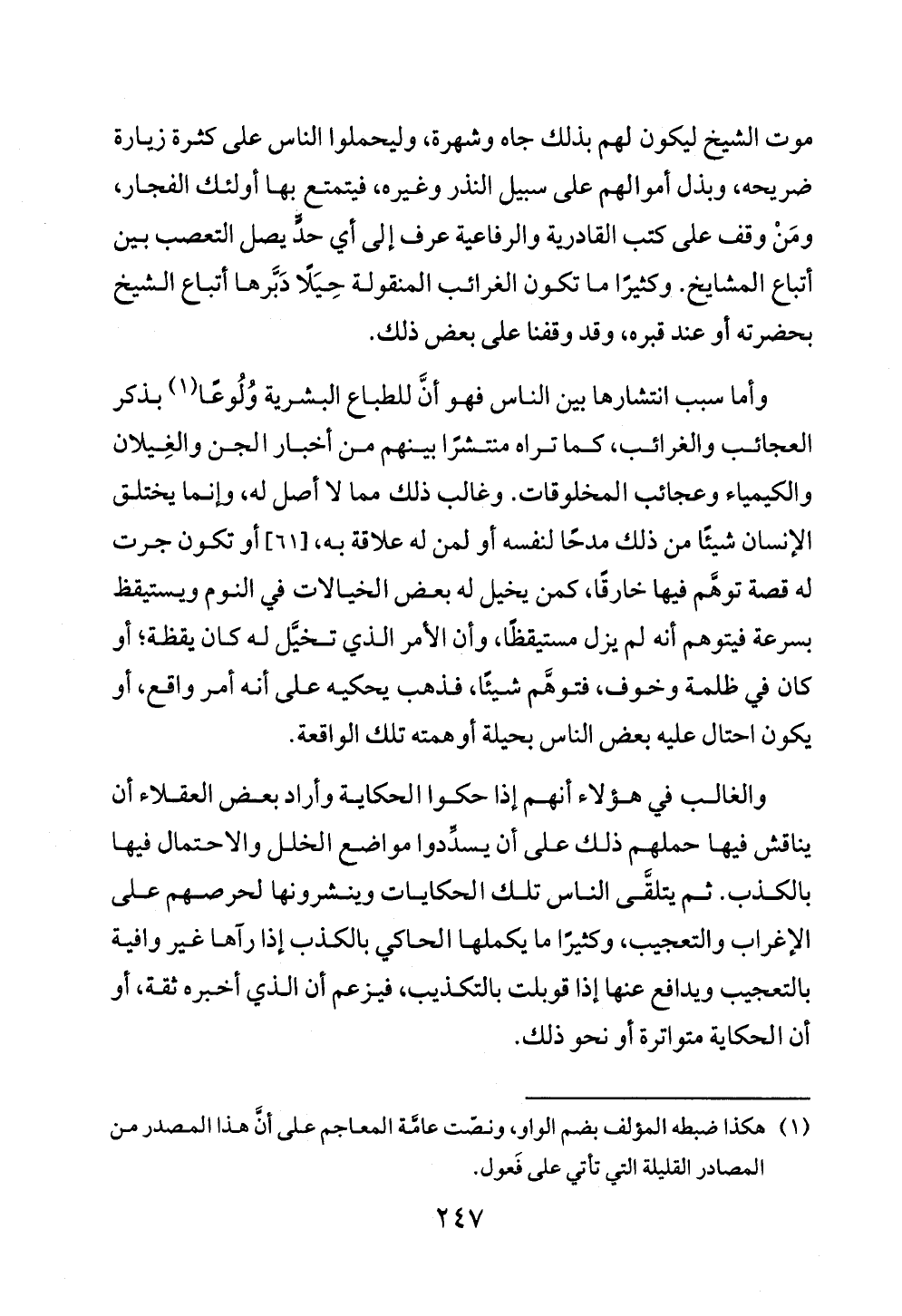 وأما سبب انتشارها بين الناس فهو أنَّ للطباع البشرية وُلُوعًا (¬١) بذكر العجائب والغرائب, كما تراه منتشرًا بينهم من أخبار الجن والغِيلان والكيمياء وعجائب المخلوقات. وغالب ذلك مما لا أصل له، وإنما يختلق الإنسان شيئًا من ذلك مدحًا لنفسه أو لمن له علاقة به، [٦١] أو تكون جرت له قصة توهَّم فيها خارقًا، كمن يخيل له بعض الخيالات في النوم ويستيقظ بسرعة فيتوهم أنه لم يزل مستيقظًا، وأن الأمر الذي تخيَّل له كان يقظة؛ أو كان في ظلمة وخوف، فتوهَّم شيئًا، فذهب يحكيه على أنه أمر واقع، أو يكون احتال عليه بعض الناس بحيلة أوهمته تلك الواقعة.