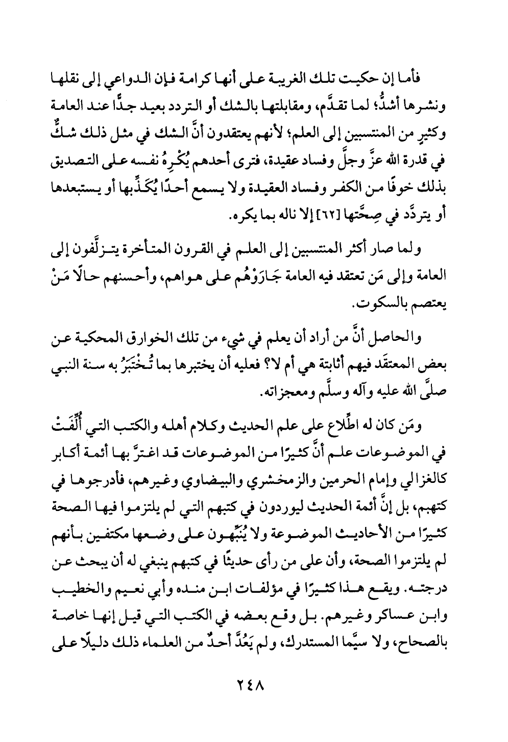فأما إن حكيت تلك الغريبة على أنها كرامة فإن الدواعي إلى نقلها ونشرها أشدُّ؛ لما تقدَّم، ومقابلتها بالشك أو التردد بعيد جدًّا عند العامة وكثيرٍ من المنتسبين إلى العلم؛ لأنهم يعتقدون أنَّ الشك في مثل ذلك شكٌّ في قدرة الله عزَّ وجلَّ وفساد عقيدة، فترى أحدهم يُكْرِهُ نفسه على التصديق بذلك خوفًا من الكفر وفساد العقيدة ولا يسمع أحدًا يُكَذِّبها أو يستبعدها أو يتردَّد في صِحَّتها [٦٢] إلا ناله بما يكره.