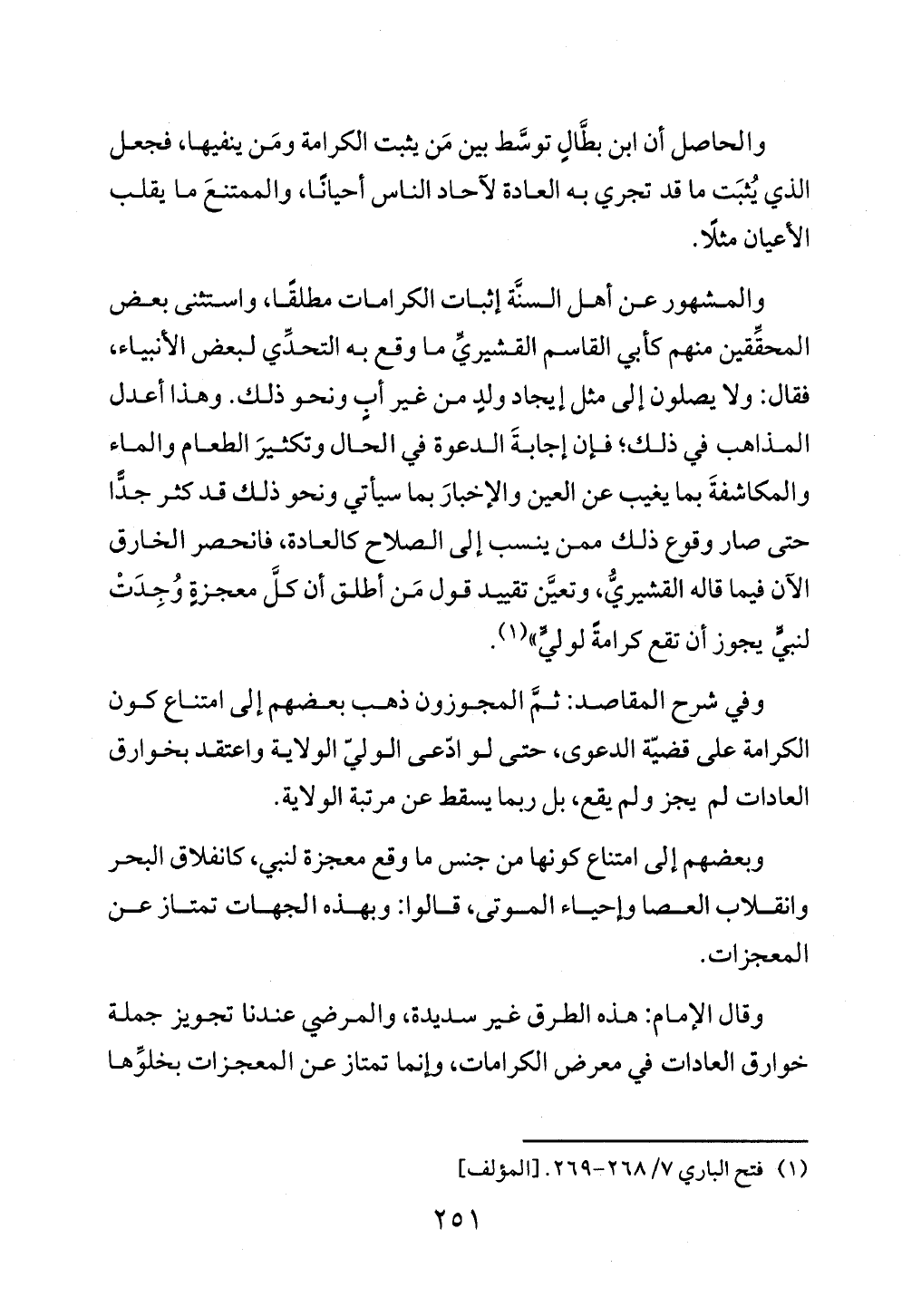 والحاصل أن ابن بطَّالٍ توسَّط بين مَن يثبت الكرامة ومَن ينفيها، فجعل الذي يُثبَت ما قد تجري به العادة لآحاد الناس أحيانًا، والممتنعَ ما يقلب الأعيان مثلًا.