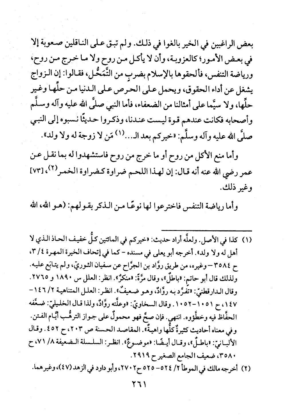 بعض الراغبين في الخير بالغوا في ذلك. ولم تبق على الناقلين صعوبة إلا في بعض الأمور؛ كالعزوبة، وأن لا يأكل من روح ولا ما خرج من روح، ورياضة التنفس، فألحقوها بالإسلام بضربٍ من التَّمَحُّل، فقالوا: إن الزواج يشغل عن أداء الحقوق، ويحمل على الحرص على الدنيا من حلِّها وغير حلِّها، ولا سيَّما على أمثالنا من الضعفاء، فأما النبي صلَّى الله عليه وآله وسلَّم وأصحابه فكانت عندهم قوة ليست عندنا، وذكروا حديثًا نسبوه إلى النبي صلَّى الله عليه وآله وسلَّم: «خيركم بعد الـ ... (¬١) مَن لا زوجة له ولا ولد».