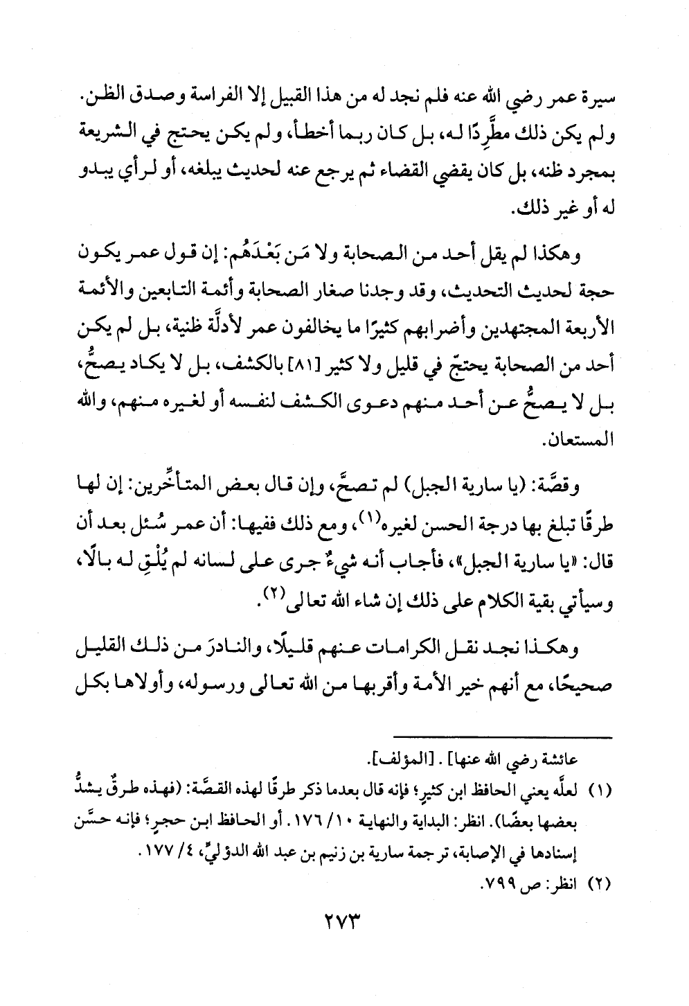 سيرة عمر رضي الله عنه فلم نجد له من هذا القبيل إلا الفراسة وصدق الظن. ولم يكن ذلك مطَّرِدًا له، بل كان ربما أخطأ، ولم يكن يحتج في الشريعة بمجرد ظنه، بل كان يقضي القضاء ثم يرجع عنه لحديث يبلغه، أو لرأي يبدو له أو غير ذلك.