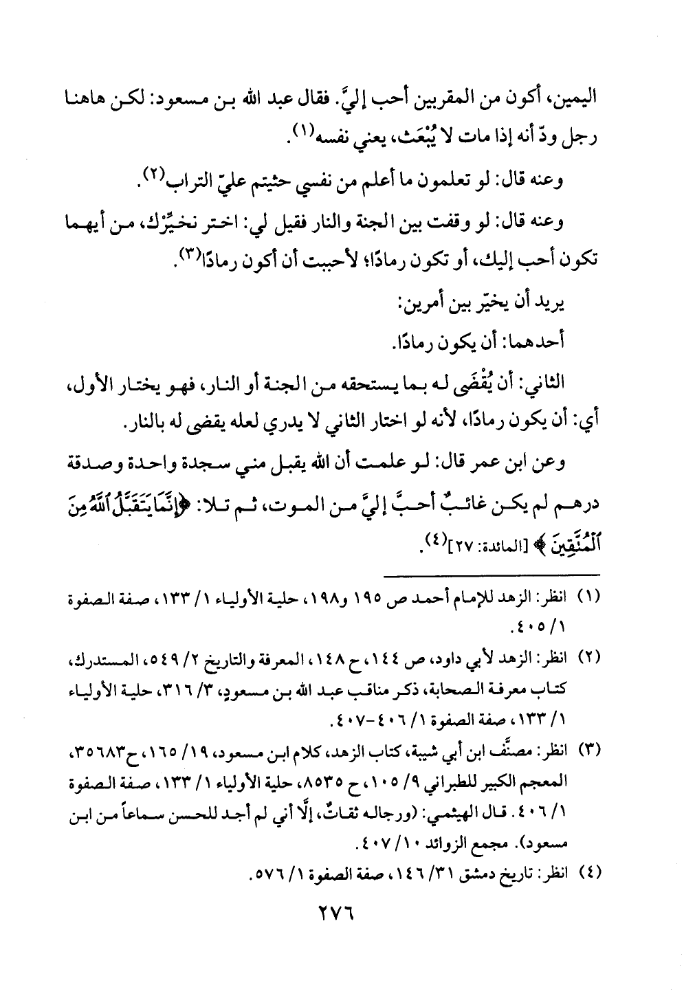 (¬٣) انظر: مصنَّف ابن أبي شيبة، كتاب الزهد، كلام ابن مسعود، ١٩/ ١٦٥، ح ٣٥٦٨٣، المعجم الكبير للطبراني ٩/ ١٠٥، ح ٨٥٣٥، حلية الأولياء ١/ ١٣٣، صفة الصفوة ١/ ٤٠٦. قال الهيثمي: (ورجاله ثقاتٌ، إلَّا أني لم أجد للحسن سماعاً من ابن مسعود). مجمع الزوائد ١٠/ ٤٠٧.