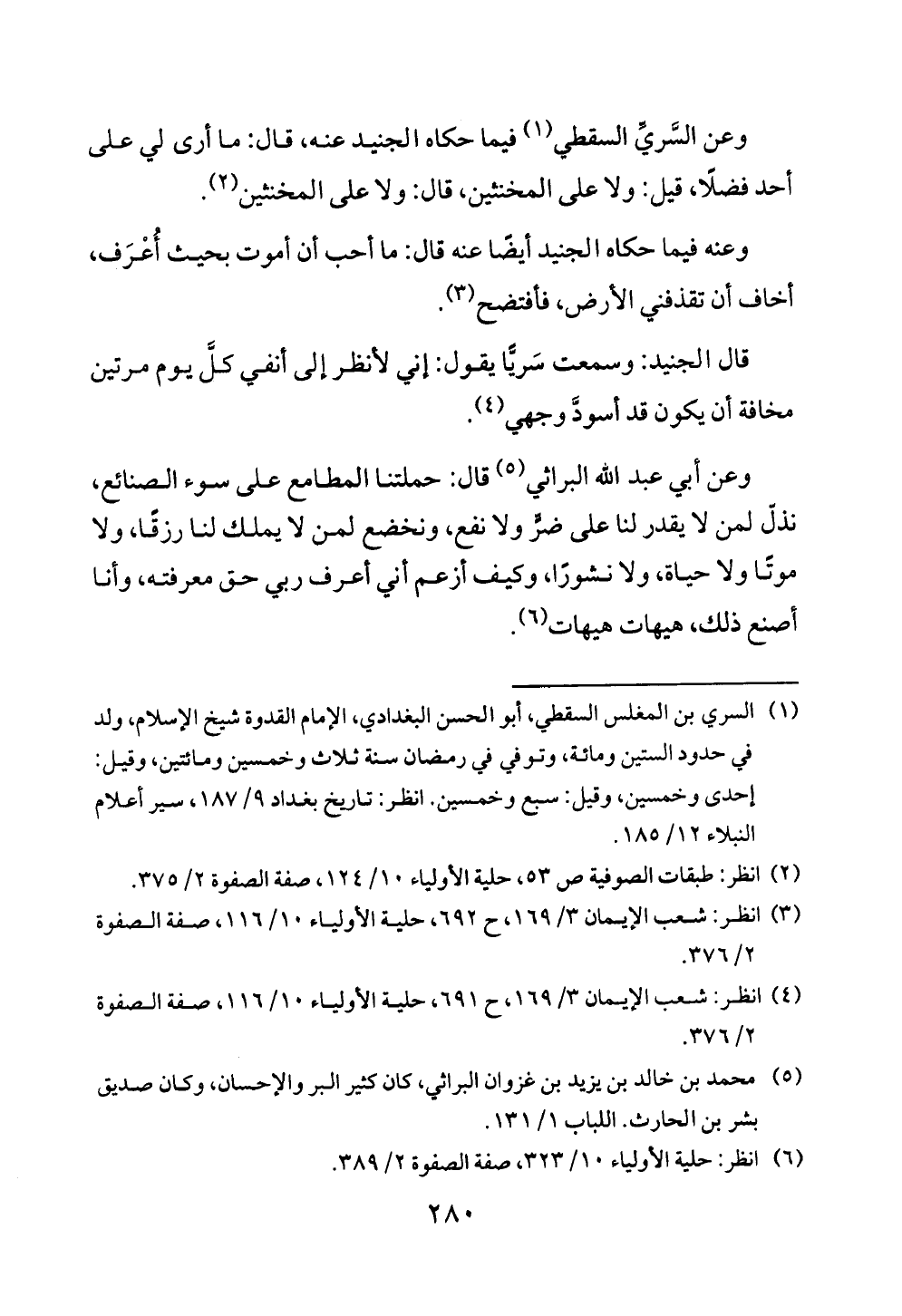 قال الجنيد: وسمعت سَريًّا يقول: إني لأنظر إلى أنفي كلَّ يوم مرتين مخافة أن يكون قد أسودَّ وجهي (¬٤).