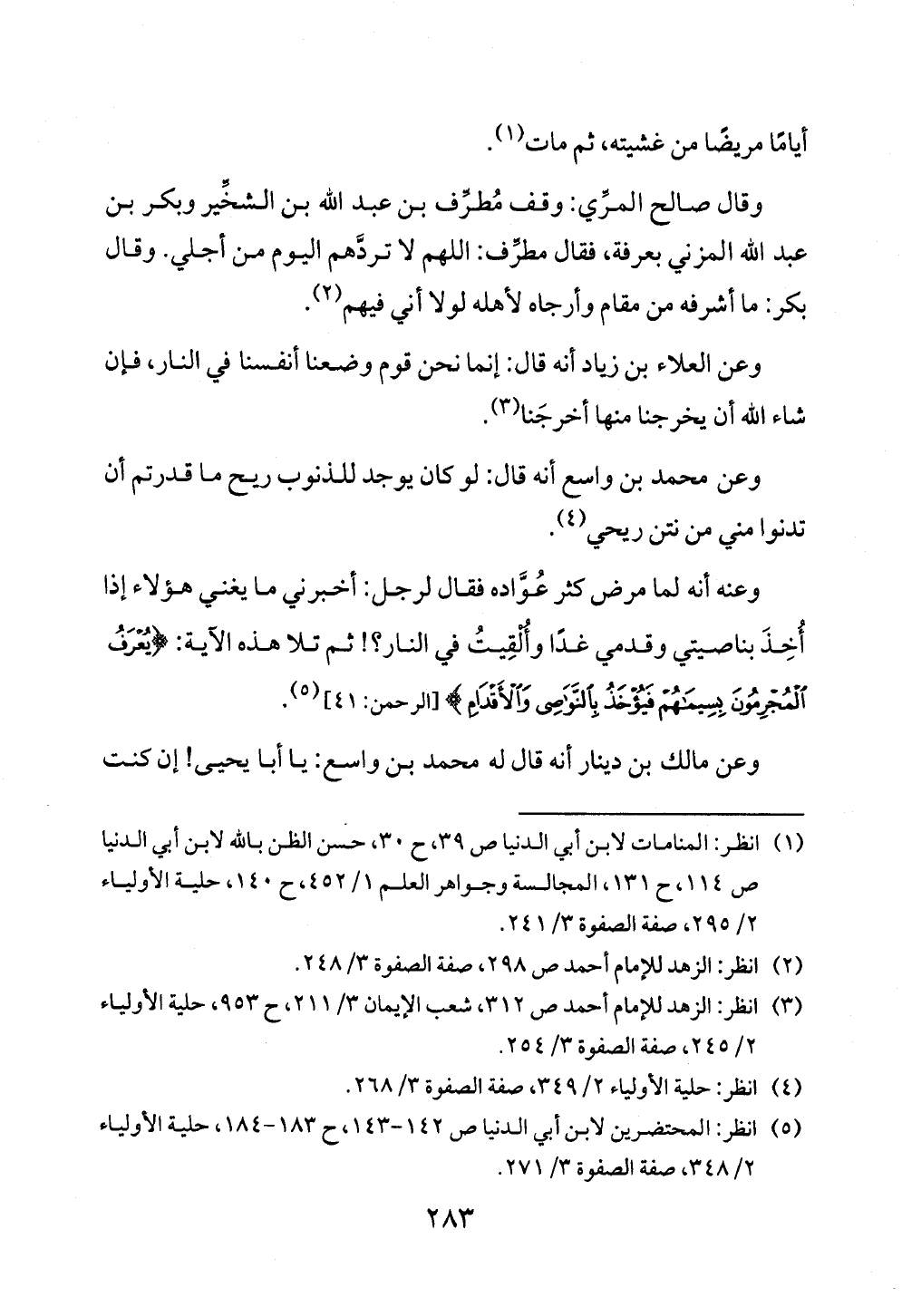 (¬٥) انظر: المحتضرين لابن أبي الدنيا ص ١٤٢ - ١٤٣، ح ١٨٣ - ١٨٤، حلية الأولياء ٢/ ٣٤٨، صفة الصفوة ٣/ ٢٧١.