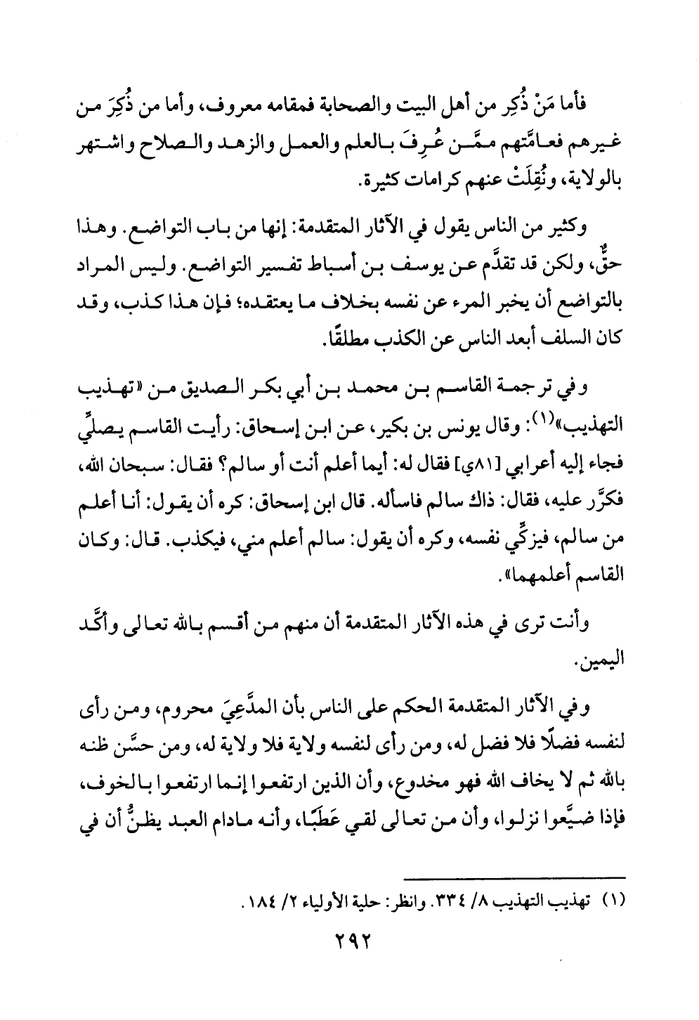 وفي ترجمة القاسم بن محمد بن أبي بكر الصديق من «تهذيب التهذيب» (¬١): وقال يونس بن بكير، عن ابن إسحاق: رأيت القاسم يصلِّي فجاء إليه أعرابي [٨١ ي] فقال له: أيما أعلم أنت أو سالم؟ فقال: سبحان الله، فكرَّر عليه، فقال: ذاك سالم فاسأله. قال ابن إسحاق: كره أن يقول: أنا أعلم من سالم، فيزكِّي نفسه, وكره أن يقول: سالم أعلم مني، فيكذب. قال: وكان القاسم أعلمهما».