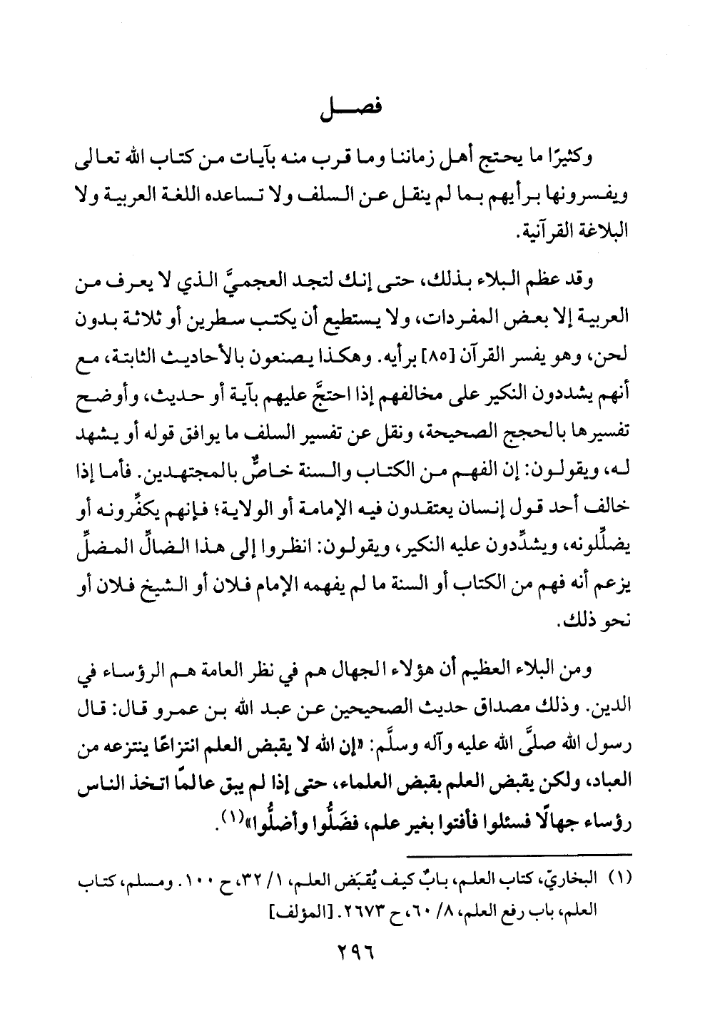 (¬١) البخاريّ، كتاب العلم، بابٌ كيف يُقبَض العلم، ١/ ٣٢، ح ١٠٠. ومسلم، كتاب العلم، باب رفع العلم، ٨/ ٦٠، ح ٢٦٧٣. [المؤلف]