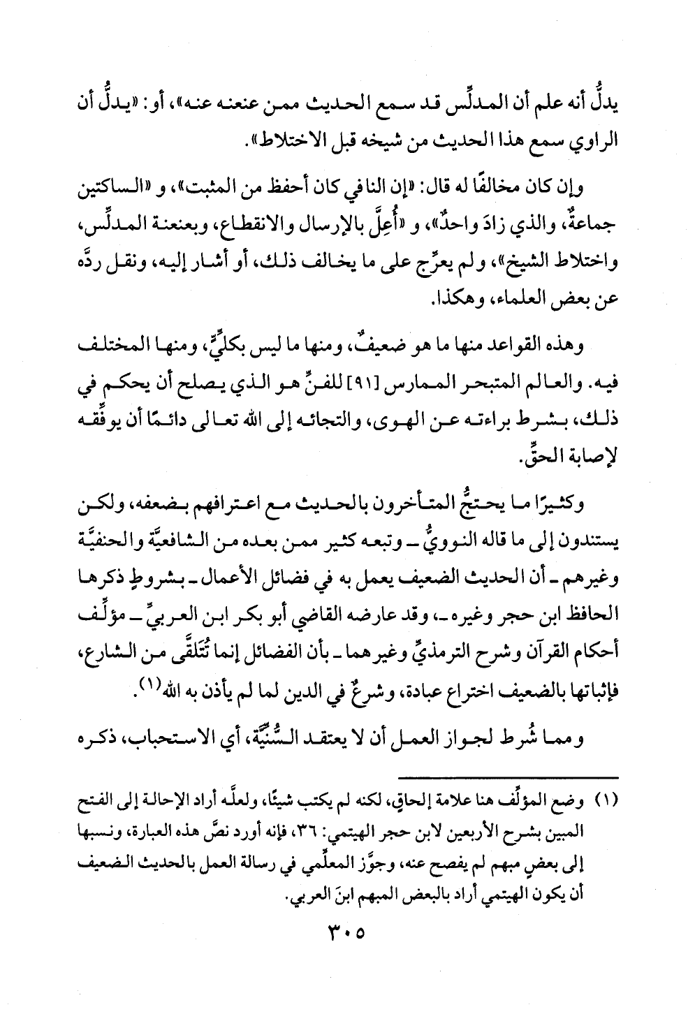 (¬١) وضع المؤلِّف هنا علامة إلحاقٍ، لكنه لم يكتب شيئًا، ولعلَّه أراد الإحالة إلى الفتح المبين بشرح الأربعين لابن حجر الهيتمي: ٣٦، فإنه أورد نصَّ هذه العبارة، ونسبها إلى بعضٍ مبهم لم يفصح عنه، وجوَّز المعلِّمي في رسالة العمل بالحديث الضعيف أن يكون الهيتمي أراد بالبعض المبهم ابنَ العربي.