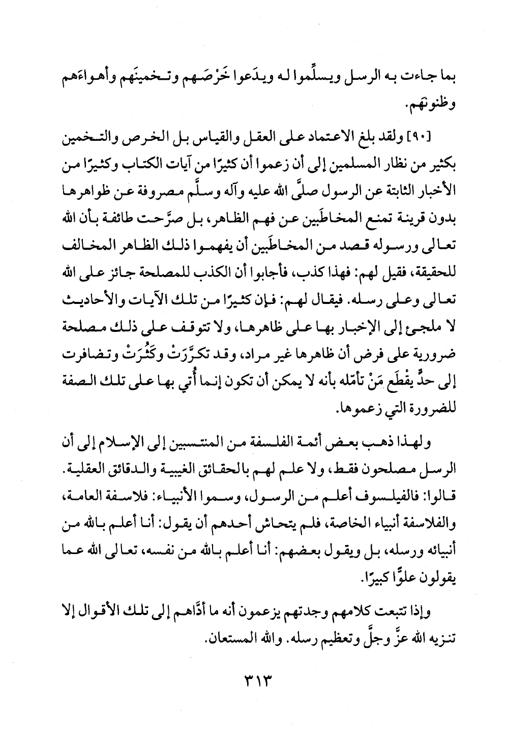 ولهذا ذهب بعض أئمة الفلسفة من المنتسبين إلى الإسلام إلى أن الرسل مصلحون فقط، ولا علم لهم بالحقائق الغيبية والدقائق العقلية. قالوا: فالفيلسوف أعلم من الرسول، وسموا الأنبياء: فلاسفة العامة، والفلاسفة أنبياء الخاصة، فلم يتحاش أحدهم أن يقول: أنا أعلم بالله من أنبيائه ورسله، بل ويقول بعضهم: أنا أعلم بالله من نفسه، تعالى الله عما يقولون علوًّا كبيرًا.
