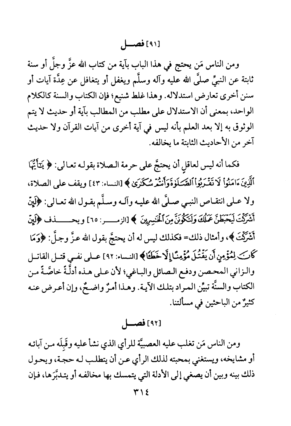 فكما أنه ليس لعاقلٍ أن يحتجَّ على حرمة الصلاة بقوله تعالى: {يَاأَيُّهَا الَّذِينَ آمَنُوا لَا تَقْرَبُوا الصَّلَاةَ وَأَنْتُمْ سُكَارَى} [النساء: ٤٣] ويقف على الصلاة, ولا على انتقاص النبي صلَّى الله عليه وآله وسلَّم بقول الله تعالى: {لَئِنْ أَشْرَكْتَ لَيَحْبَطَنَّ عَمَلُكَ وَلَتَكُونَنَّ مِنَ الْخَاسِرِينَ} [الزمر: ٦٥] ويحذف {لَئِنْ أَشْرَكْتَ} , وأمثال ذلك= فكذلك ليس له أن يحتجَّ بقول الله عزَّ وجلَّ: {وَمَا كَانَ لِمُؤْمِنٍ أَنْ يَقْتُلَ مُؤْمِنًا إِلَّا خَطَأً} [النساء: ٩٢] على نفي قتل القاتل والزاني المحصن ودفع الصائل والباغي؛ لأن على هذه أدلَّةً خاصَّةً من الكتاب والسنَّة تبيِّن المراد بتلك الآية. وهذا أمرٌ واضحٌ، وإن أعرض عنه كثيرٌ من الباحثين في مسألتنا.