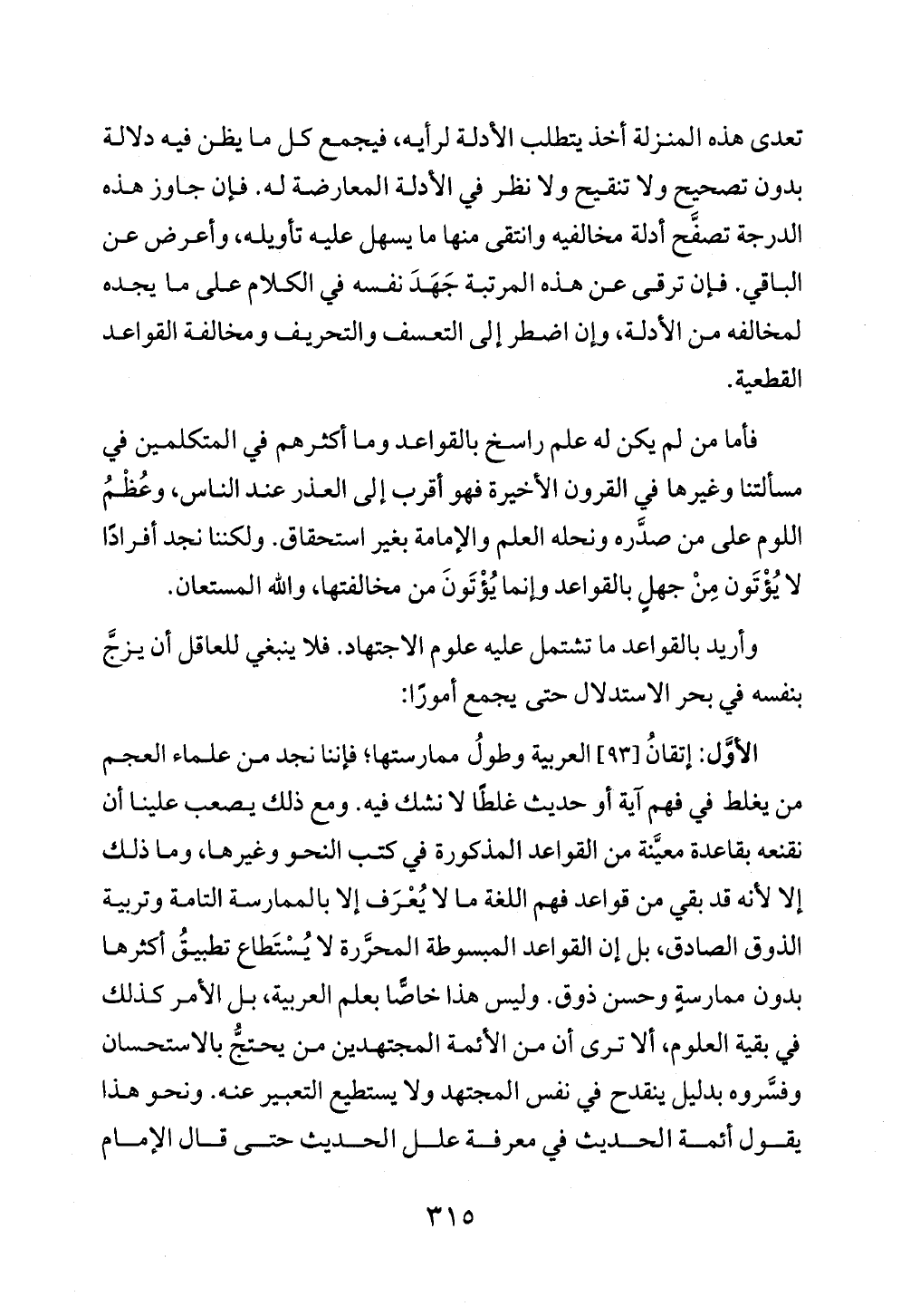الأوَّل: إتقانُ [٩٣] العربية وطولُ ممارستها؛ فإننا نجد من علماء العجم من يغلط في فهم آية أو حديث غلطًا لا نشك فيه. ومع ذلك يصعب علينا أن نقنعه بقاعدة معيَّنة من القواعد المذكورة في كتب النحو وغيرها، وما ذلك إلا لأنه قد بقي من قواعد فهم اللغة ما لا يُعْرَف إلا بالممارسة التامة وتربية الذوق الصادق، بل إن القواعد المبسوطة المحرَّرة لا يُسْتَطاع تطبيقُ أكثرها بدون ممارسةٍ وحسن ذوق. وليس هذا خاصًّا بعلم العربية، بل الأمر كذلك في بقية العلوم، ألا ترى أن من الأئمة المجتهدين من يحتجُّ بالاستحسان وفسَّروه بدليل ينقدح في نفس المجتهد ولا يستطيع التعبير عنه. ونحو هذا يقول أئمة الحديث في معرفة علل الحديث حتى قال الإمام