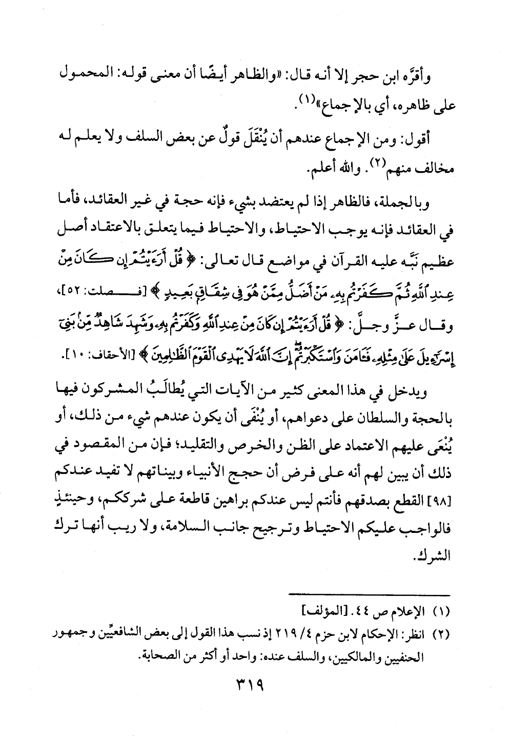 وبالجملة، فالظاهر إذا لم يعتضد بشيء فإنه حجة في غير العقائد، فأما في العقائد فإنه يوجب الاحتياط، والاحتياط فيما يتعلق بالاعتقاد أصل عظيم نَبَّه عليه القرآن في مواضع قال تعالى: {قُلْ أَرَأَيْتُمْ إِنْ كَانَ مِنْ عِنْدِ اللَّهِ ثُمَّ كَفَرْتُمْ بِهِ مَنْ أَضَلُّ مِمَّنْ هُوَ فِي شِقَاقٍ بَعِيدٍ} [فصلت: ٥٢] , وقال عزَّ وجلَّ: {قُلْ أَرَأَيْتُمْ إِنْ كَانَ مِنْ عِنْدِ اللَّهِ وَكَفَرْتُمْ بِهِ وَشَهِدَ شَاهِدٌ مِنْ بَنِي إِسْرَائِيلَ عَلَى مِثْلِهِ فَآمَنَ وَاسْتَكْبَرْتُمْ إِنَّ اللَّهَ لَا يَهْدِي الْقَوْمَ الظَّالِمِينَ} [الأحقاف: ١٠].