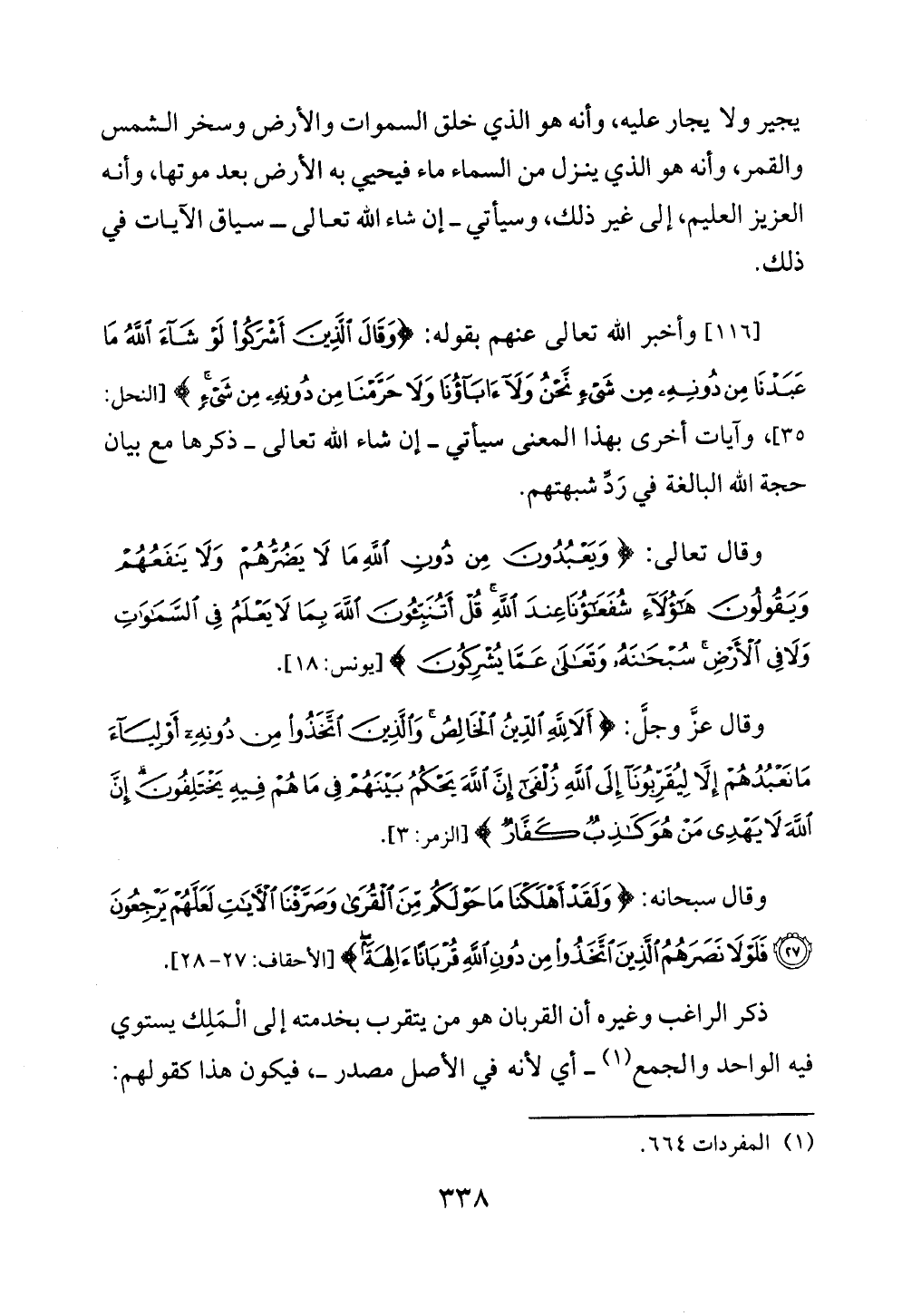 [١١٦] وأخبر الله تعالى عنهم بقوله: {وَقَالَ الَّذِينَ أَشْرَكُوا لَوْ شَاءَ اللَّهُ مَا عَبَدْنَا مِنْ دُونِهِ مِنْ شَيْءٍ نَحْنُ وَلَا آبَاؤُنَا وَلَا حَرَّمْنَا مِنْ دُونِهِ مِنْ شَيْءٍ} [النحل: ٣٥]، وآيات أخرى بهذا المعنى سيأتي ــ إن شاء الله تعالى ــ ذكرها مع بيان حجة الله البالغة في رَدِّ شبهتهم.