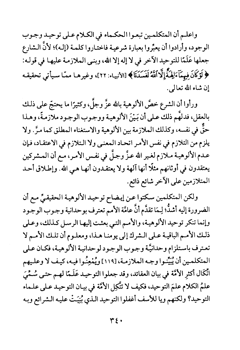 ولكن المتكلمين سكتوا عن إيضاح توحيد الألوهية الحقيقيِّ مع أن الضرورة إليه أشدُّ؛ لِمَا تقدَّم أنَّ عامَّة الأمم تعترف بوحدانية وجوب الوجود وإنما تنكر توحيد الألوهية، والأمم التي بعثت إليها الرسل كذلك، وعلى ذلك الأمم الباقية على الشرك إلى يومنا هذا، ومعلوم أن تلك الأمم لا تعترف باستلزام وحدانيَّة وجوب الوجود لوحدانية الألوهية, فكان على المتكلمين أن يُبَيِّنوا وجه الملازمة، [١١٩] ويُمْعِنُوا فيه، كيف لا وعليهم اتِّكَال أكثرِ الأمَّة في بيان العقائد، وقد جعلوا التوحيد عَلَمًا لهم حتى سُمِّيَ علمُ الكلام علمَ التوحيد، فكيف لا تتَّكِل الأمَّة في بيان التوحيد على علماء التوحيد؟ ولكنهم ويا للأسف أغفلوا التوحيد الذي بُنِيَتْ عليه الشرائع وبه