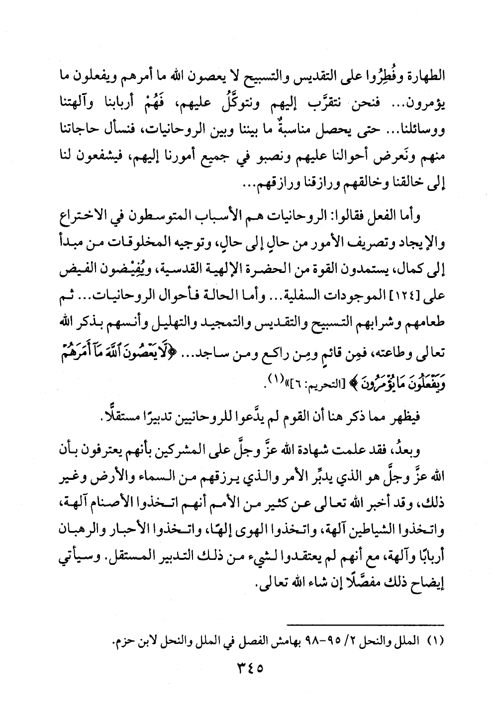 وأما الفعل فقالوا: الروحانيات هم الأسباب المتوسطون في الاختراع والإيجاد وتصريف الأمور من حالٍ إلى حالٍ، وتوجيه المخلوقات من مبدأ إلى كمال، يستمدون القوة من الحضرة الإلهية القدسية، ويُفِيْضون الفيض على [١٢٤] الموجودات السفلية ... وأما الحالة فأحوال الروحانيات ... ثم طعامهم وشرابهم التسبيح والتقديس والتمجيد والتهليل وأنسهم بذكر الله تعالى وطاعته، فمِن قائمٍ ومِن راكع ومن ساجد ... {لَا يَعْصُونَ اللَّهَ مَا أَمَرَهُمْ وَيَفْعَلُونَ مَا يُؤْمَرُونَ} [التحريم: ٦]» (¬١).