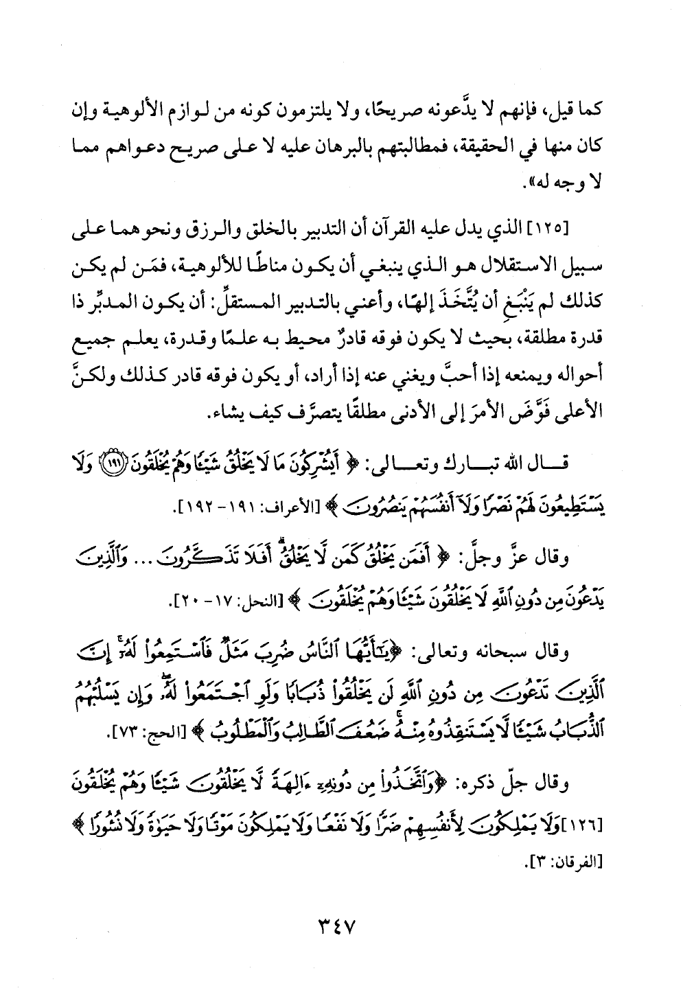 [١٢٥] الذي يدل عليه القرآن أن التدبير بالخلق والرزق ونحوهما على سبيل الاستقلال هو الذي ينبغي أن يكون مناطًا للألوهية، فمَن لم يكن كذلك لم يَنْبَغِ أن يُتَّخَذَ إلهًا، وأعني بالتدبير المستقلِّ: أن يكون المدبِّر ذا قدرة مطلقة، بحيث لا يكون فوقه قادرٌ محيط به علمًا وقدرة، يعلم جميع أحواله ويمنعه إذا أحبَّ ويغني عنه إذا أراد, أو يكون فوقه قادر كذلك ولكنَّ الأعلى فَوَّضَ الأمرَ إلى الأدنى مطلقًا يتصرَّف كيف يشاء.
