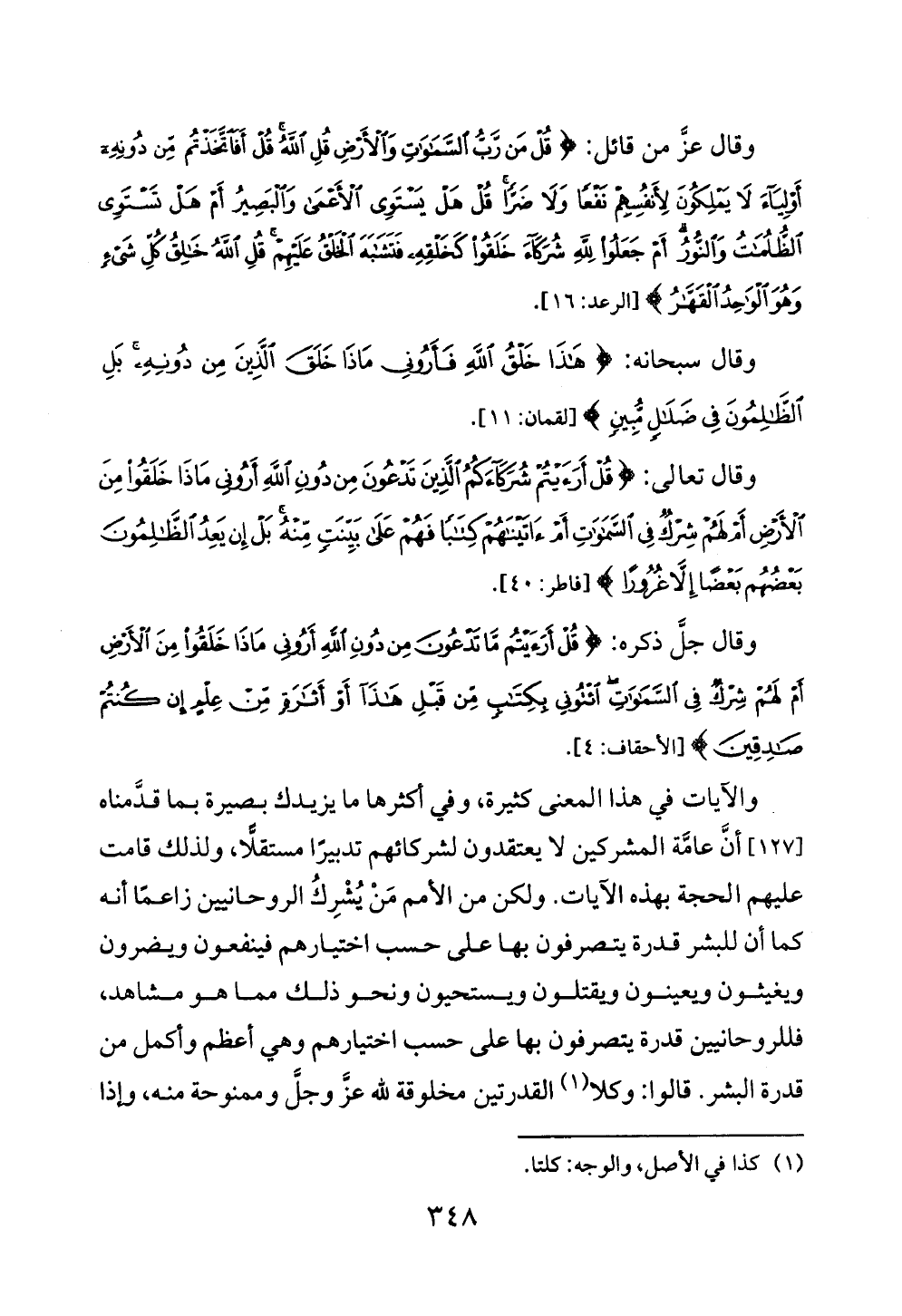 والآيات في هذا المعنى كثيرة، وفي أكثرها ما يزيدك بصيرة بما قدَّمناه [١٢٧] أنَّ عامَّة المشركين لا يعتقدون لشركائهم تدبيرًا مستقلًّا، ولذلك قامت عليهم الحجة بهذه الآيات. ولكن من الأمم مَنْ يُشْرِكُ الروحانيين زاعمًا أنه كما أن للبشر قدرة يتصرفون بها على حسب اختيارهم فينفعون ويضرون ويغيثون ويعينون ويقتلون ويستحيون ونحو ذلك مما هو مشاهد، فللروحانيين قدرة يتصرفون بها على حسب اختيارهم وهي أعظم وأكمل من قدرة البشر. قالوا: وكلا (¬١) القدرتين مخلوقة لله عزَّ وجلَّ وممنوحة منه، وإذا