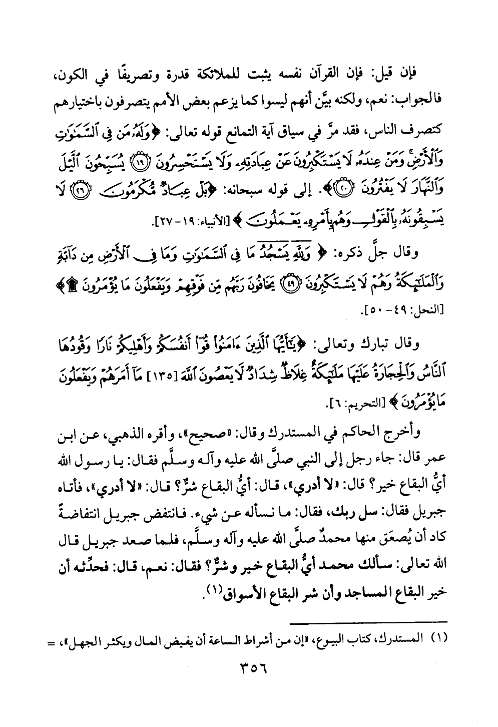 وأخرج الحاكم في المستدرك وقال: «صحيح»، وأقره الذهبي, عن ابن عمر قال: جاء رجل إلى النبي صلَّى الله عليه وآله وسلَّم فقال: يا رسول الله أيُّ البقاع خير؟ قال: «لا أدري»، قال: أيُّ البقاع شرٌّ؟ قال: «لا أدري»، فأتاه جبريل فقال: سل ربك، فقال: ما نسأله عن شيء. فانتفض جبريل انتفاضةً كاد أن يُصعَق منها محمدٌ صلَّى الله عليه وآله وسلَّم، فلما صعد جبريل قال الله تعالى: سألك محمد أيُّ البقاع خير وشرٌّ؟ فقال: نعم، قال: فحدِّثه أن خير البقاع المساجد وأن شر البقاع الأسواق (¬١).