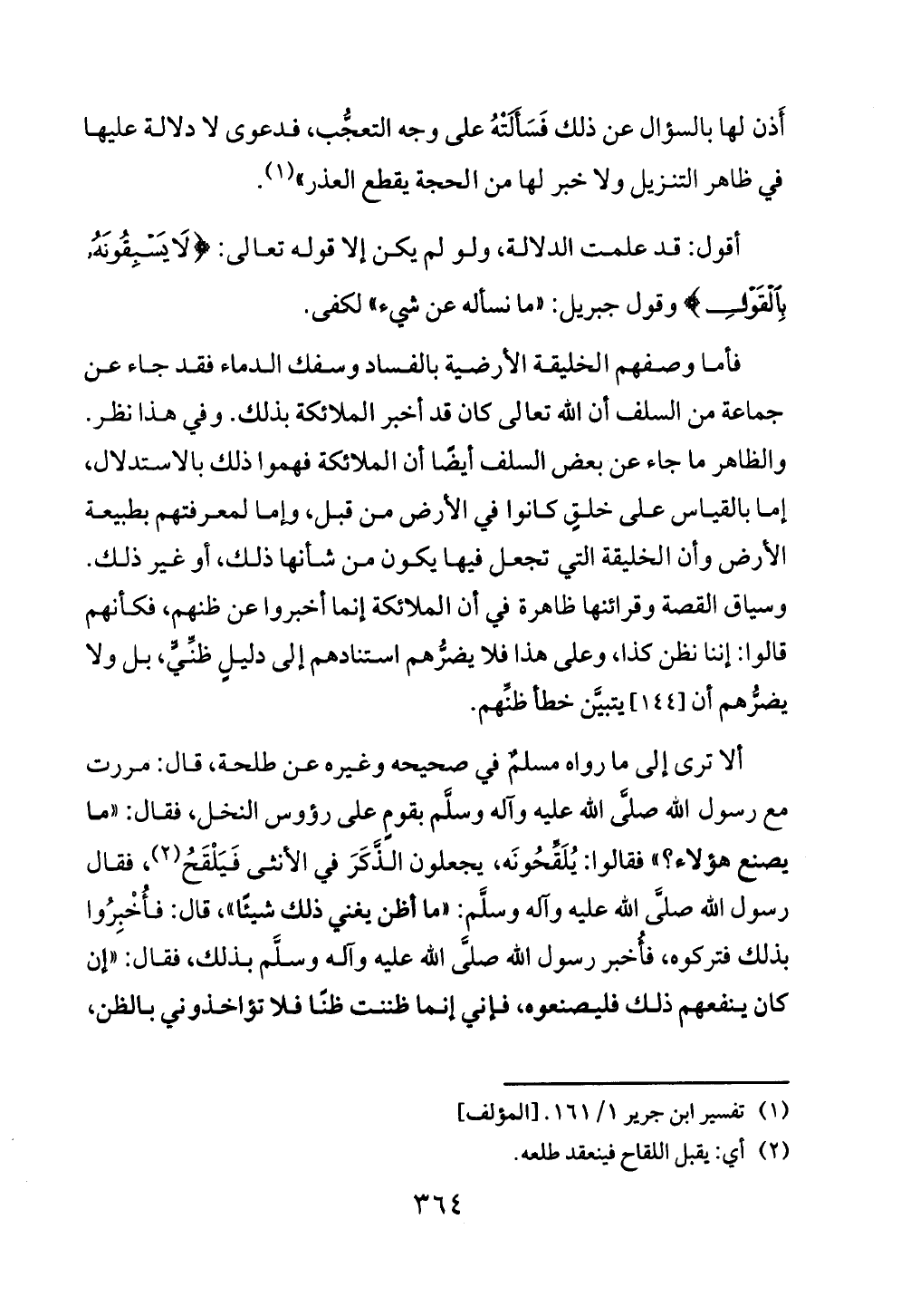 فأما وصفهم الخليقة الأرضية بالفساد وسفك الدماء فقد جاء عن جماعة من السلف أن الله تعالى كان قد أخبر الملائكة بذلك. وفي هذا نظر. والظاهر ما جاء عن بعض السلف أيضًا أن الملائكة فهموا ذلك بالاستدلال، إما بالقياس على خلقٍ كانوا في الأرض من قبل، وإما لمعرفتهم بطبيعة الأرض وأن الخليقة التي تجعل فيها يكون من شأنها ذلك، أو غير ذلك. وسياق القصة وقرائنها ظاهرة في أن الملائكة إنما أخبروا عن ظنهم, فكأنهم قالوا: إننا نظن كذا، وعلى هذا فلا يضرُّهم استنادهم إلى دليلٍ ظنِّيٍّ، بل ولا يضرُّهم أن [١٤٤] يتبيَّن خطأ ظنِّهم.
