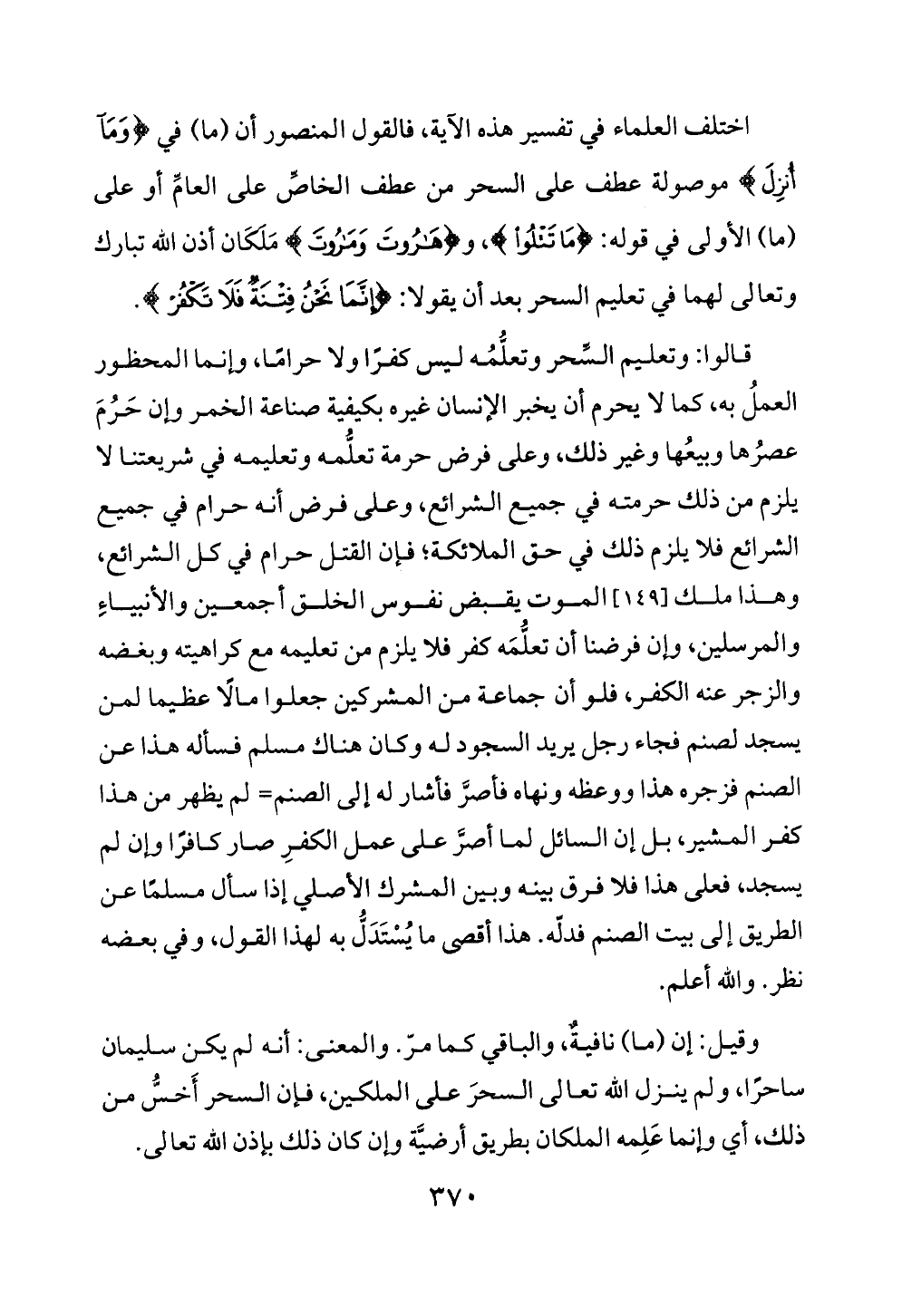 اختلف العلماء في تفسير هذه الآية, فالقول المنصور أن (ما) في {وَمَا أُنْزِلَ} موصولة عطف على السحر من عطف الخاصِّ على العامِّ أو على (ما) الأولى في قوله: {مَا تَتْلُو}، و {هَارُوتَ وَمَارُوتَ} مَلَكَان أذن الله تبارك وتعالى لهما في تعليم السحر بعد أن يقولا: {إِنَّمَا نَحْنُ فِتْنَةٌ فَلَا تَكْفُرْ}.