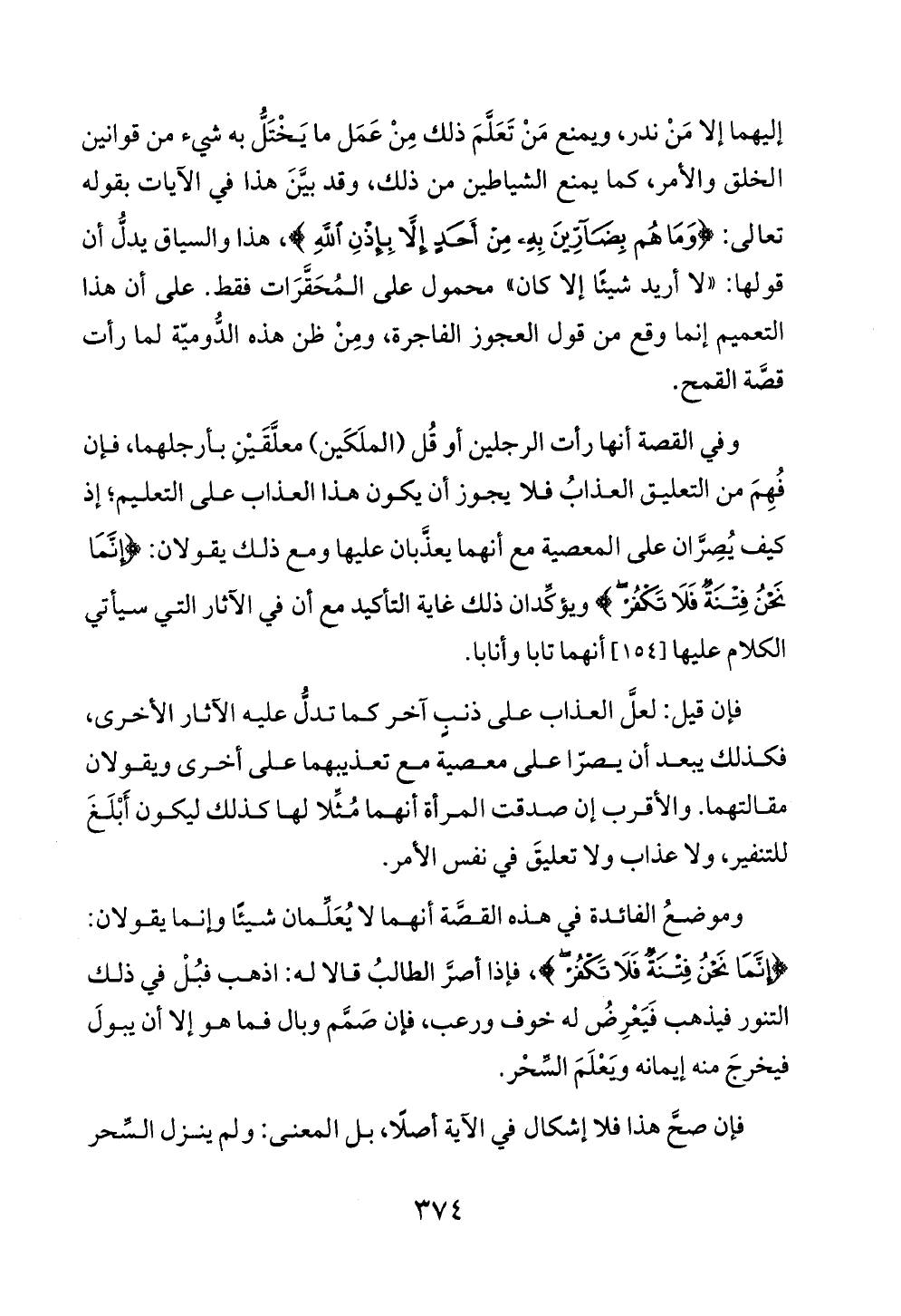 وموضعُ الفائدة في هذه القصَّة أنهما لا يُعَلِّمان شيئًا وإنما يقولان: {إِنَّمَا نَحْنُ فِتْنَةٌ فَلَا تَكْفُرْ}، فإذا أصرَّ الطالبُ قالا له: اذهب فبُلْ في ذلك التنور فيذهب فَيَعْرِضُ له خوف ورعب، فإن صَمَّم وبال فما هو إلا أن يبولَ فيخرجَ منه إيمانه ويَعْلَمَ السِّحْر.