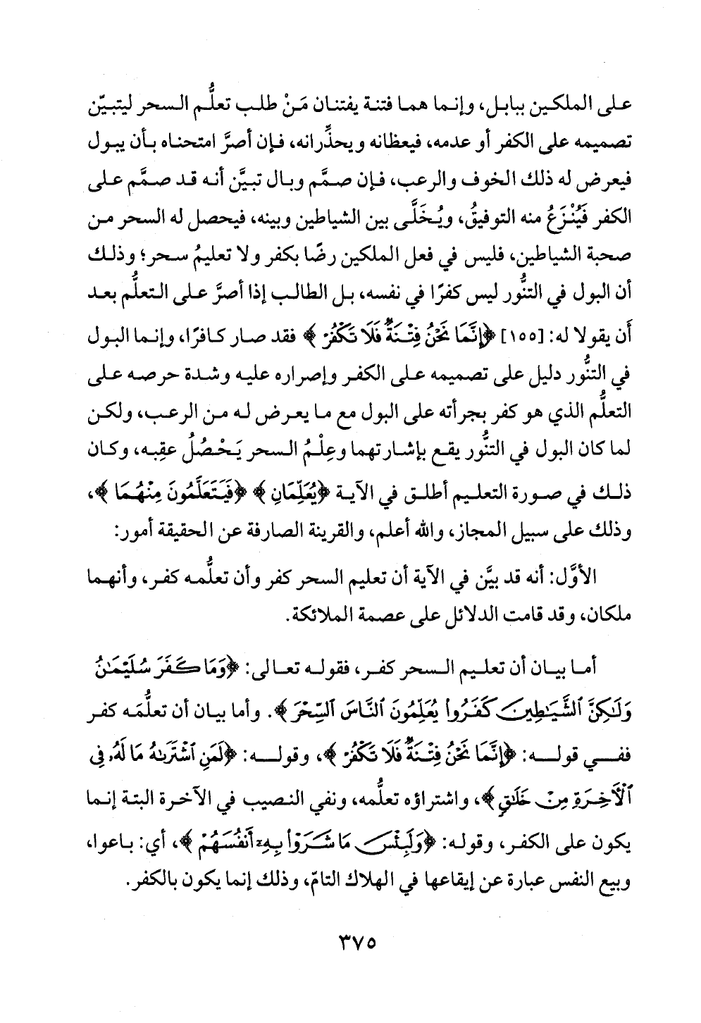 أما بيان أن تعليم السحر كفر، فقوله تعالى: {وَمَا كَفَرَ سُلَيْمَانُ وَلَكِنَّ الشَّيَاطِينَ كَفَرُوا يُعَلِّمُونَ النَّاسَ السِّحْرَ}. وأما بيان أن تعلُّمَه كفر ففي قوله: {إِنَّمَا نَحْنُ فِتْنَةٌ فَلَا تَكْفُرْ}، وقوله: {لَمَنِ اشْتَرَاهُ مَا لَهُ فِي الْآخِرَةِ مِنْ خَلَاقٍ}، واشتراؤه تعلُّمه, ونفي النصيب في الآخرة البتة إنما يكون على الكفر، وقوله: {وَلَبِئْسَ مَا شَرَوْا بِهِ أَنْفُسَهُمْ}، أي: باعوا، وبيع النفس عبارة عن إيقاعها في الهلاك التامّ، وذلك إنما يكون بالكفر.