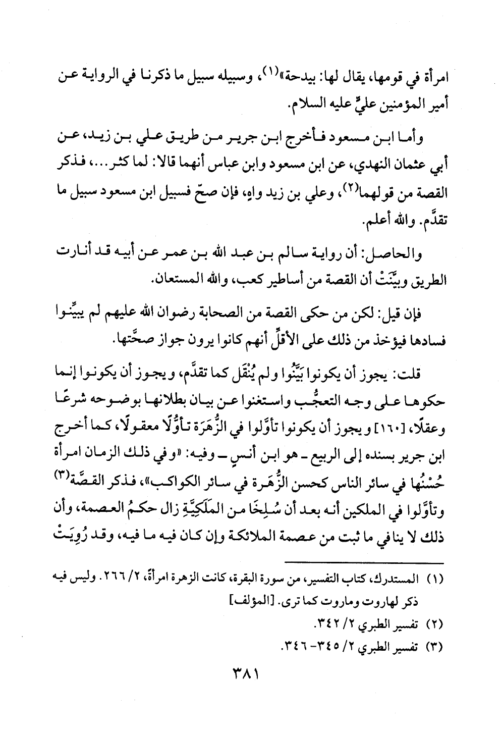 قلت: يجوز أن يكونوا بَيَّنُوا ولم يُنْقَل كما تقدَّم، ويجوز أن يكونوا إنما حكوها على وجه التعجُّب واستغنوا عن بيان بطلانها بوضوحه شرعًا وعقلًا، [١٦٠] ويجوز أن يكونوا تأوَّلوا في الزُّهَرَة تأوُّلًا معقولًا، كما أخرج ابن جرير بسنده إلى الربيع ــ هو ابن أنسٍ ــ وفيه: "وفي ذلك الزمان امرأة حُسْنُها في سائر الناس كحسن الزُّهَرة في سائر الكواكب"، فذكر القصَّة (¬٣) وتأوَّلوا في الملكين أنه بعد أن سُلِخَا من المَلَكِيَّةِ زال حكمُ العصمة, وأن ذلك لا ينافي ما ثبت من عصمة الملائكة وإن كان فيه ما فيه، وقد رُوِيَتْ