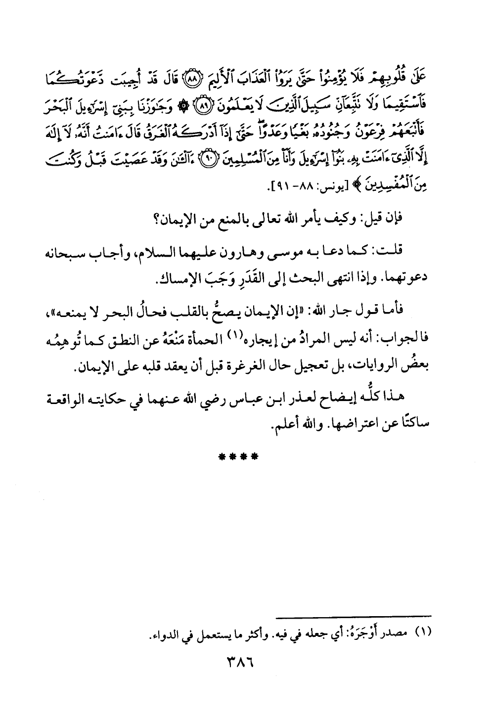 فأما قول جار الله: "إن الإيمان يصحُّ بالقلب فحالُ البحر لا يمنعه"، فالجواب: أنه ليس المرادُ من إيجاره (¬١) الحمأة مَنْعَهُ عن النطق كما تُوهِمُه بعضُ الروايات، بل تعجيل حال الغرغرة قبل أن يعقد قلبه على الإيمان.