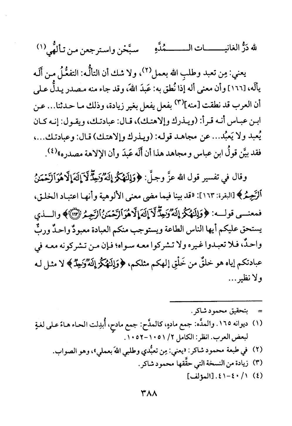 وقال في تفسير قول الله عزَّ وجلَّ: {وَإِلَهُكُمْ إِلَهٌ وَاحِدٌ لَا إِلَهَ إِلَّا هُوَ الرَّحْمَنُ الرَّحِيمُ} [البقرة: ١٦٣]: "قد بينا فيما مضى معنى الألوهية وأنها اعتباد الخلق، فمعنى قوله: {وَإِلَهُكُمْ إِلَهٌ وَاحِدٌ لَا إِلَهَ إِلَّا هُوَ الرَّحْمَنُ الرَّحِيمُ (١٦٣)} والذي يستحق عليكم أيها الناس الطاعة ويستوجب منكم العبادة معبودٌ واحدٌ وربٌّ واحدٌ، فلا تعبدوا غيره ولا تشركوا معه سواه؛ فإن من تشركونه معه في عبادتكم إياه هو خلقٌ من خَلْقِ إلهكم مثلكم, {وَإِلَهُكُمْ إِلَهٌ وَاحِدٌ} لا مثل له ولا نظير ...