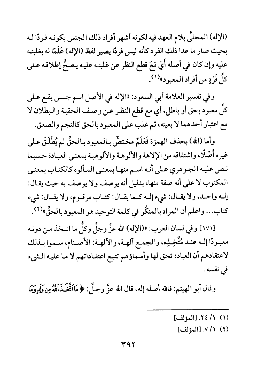 [١٧١] وفي لسان العرب: " (الإله) الله عزَّ وجلَّ وكلُّ ما اتخذ من دونه معبودًا إله عند مُتَّخِذِه، والجمع آلهة، والآلهة: الأصنام, سموا بذلك لاعتقادهم أن العبادة تحق لها وأسماؤهم تتبع اعتقاداتهم لا ما عليه الشيء في نفسه.