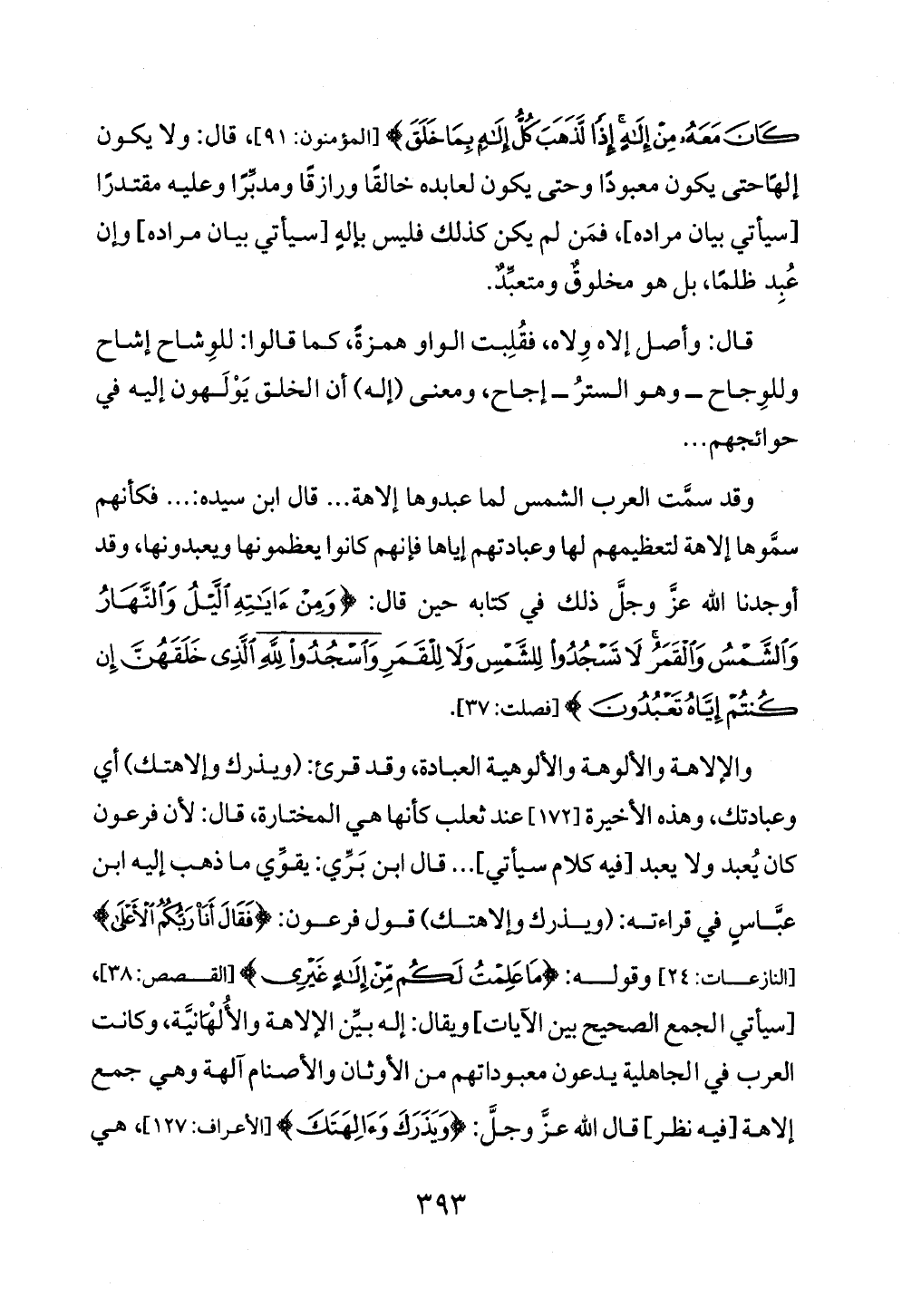 والإلاهة والألوهة والألوهية العبادة، وقد قرئ: (ويذرك وإلاهتك) أي وعبادتك, وهذه الأخيرة [١٧٢] عند ثعلب كأنها هي المختارة، قال: لأن فرعون كان يُعبد ولا يعبد [فيه كلام سيأتي] ... قال ابن بَرِّي: يقوِّي ما ذهب إليه ابن عبَّاسٍ في قراءته: (ويذرك وإلاهتك) قول فرعون: {فَقَالَ أَنَا رَبُّكُمُ الْأَعْلَى} [النازعات: ٢٤] وقوله: {مَا عَلِمْتُ لَكُمْ مِنْ إِلَهٍ غَيْرِي} [القصص: ٣٨]، [سيأتي الجمع الصحيح بين الآيات] ويقال: إله بيِّن الإلاهة والأُلْهَانيَّة, وكانت العرب في الجاهلية يدعون معبوداتهم من الأوثان والأصنام آلهة وهي جمع إلاهة [فيه نظر] قال الله عزَّ وجلَّ: {وَيَذَرَكَ وَآلِهَتَكَ} [الأعراف: ١٢٧]، هي