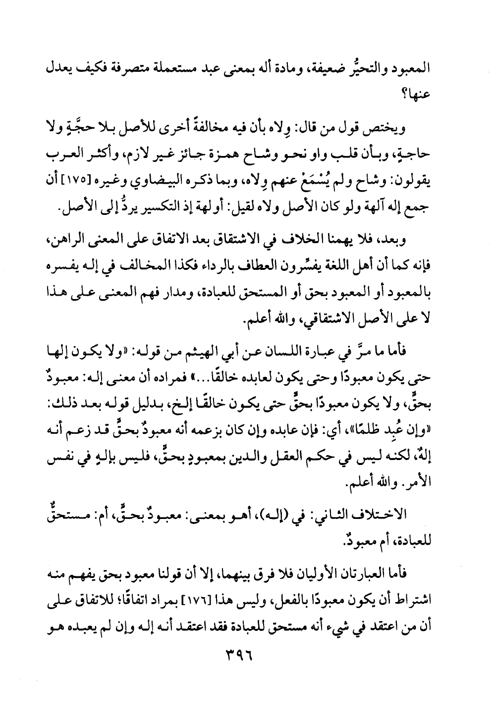 فأما العبارتان الأوليان فلا فرق بينهما، إلا أن قولنا معبود بحق يفهم منه اشتراط أن يكون معبودًا بالفعل، وليس هذا [١٧٦] بمراد اتفاقًا؛ للاتفاق على أن من اعتقد في شيء أنه مستحق للعبادة فقد اعتقد أنه إله وإن لم يعبده هو