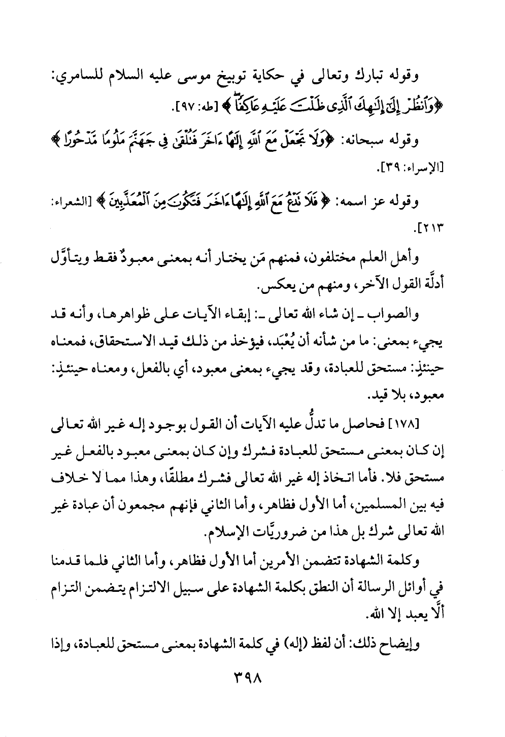 [١٧٨] فحاصل ما تدلُّ عليه الآيات أن القول بوجود إله غير الله تعالى إن كان بمعنى مستحق للعبادة فشرك وإن كان بمعنى معبود بالفعل غير مستحق فلا. فأما اتخاذ إله غير الله تعالى فشرك مطلقًا، وهذا مما لا خلاف فيه بين المسلمين، أما الأول فظاهر، وأما الثاني فإنهم مجمعون أن عبادة غير الله تعالى شرك بل هذا من ضروريَّات الإسلام.
