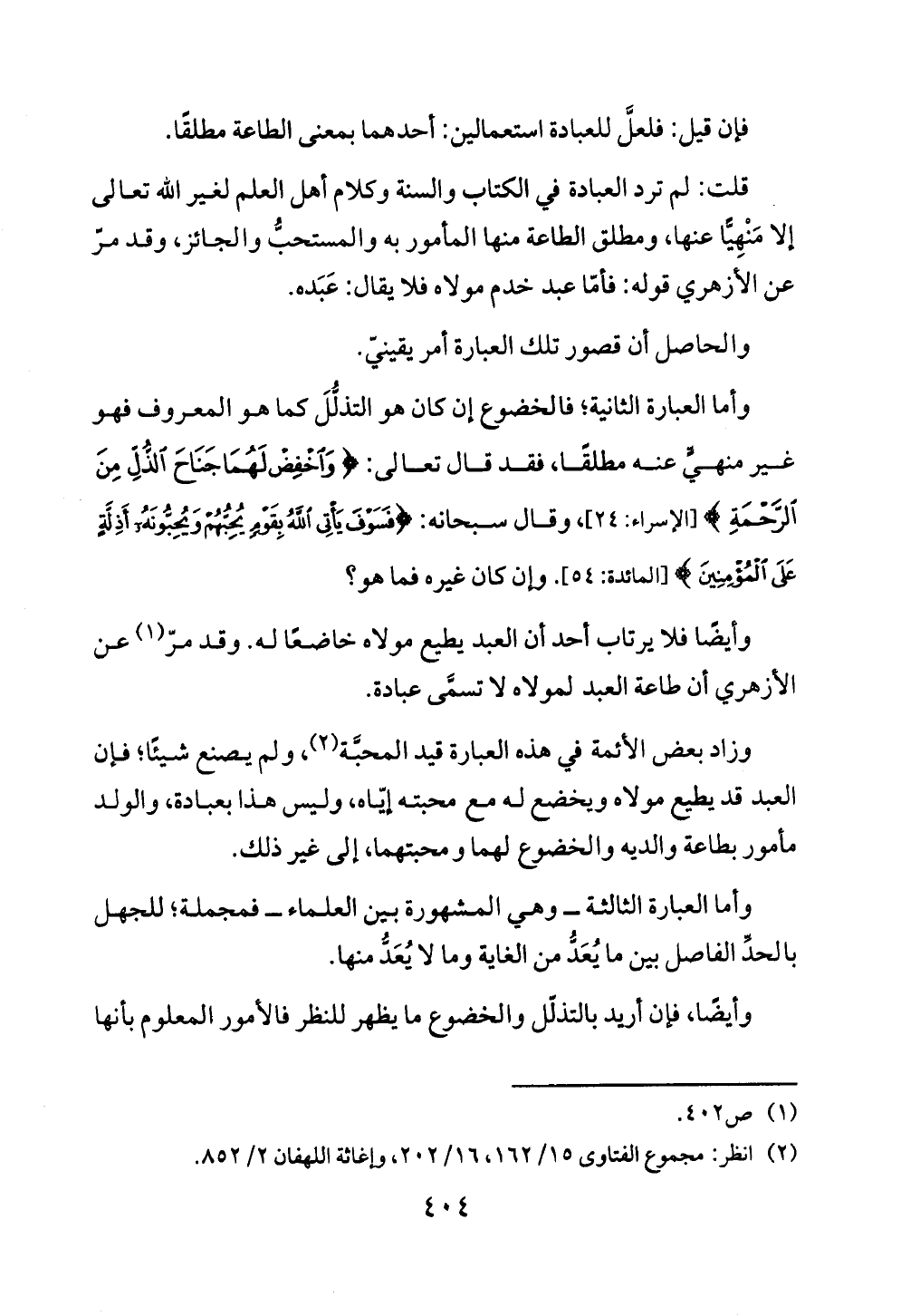 قلت: لم ترد العبادة في الكتاب والسنة وكلام أهل العلم لغير الله تعالى إلا مَنْهِيًّا عنها، ومطلق الطاعة منها المأمور به والمستحبُّ والجائز، وقد مرّ عن الأزهري قوله: فأمّا عبد خدم مولاه فلا يقال: عَبَده.