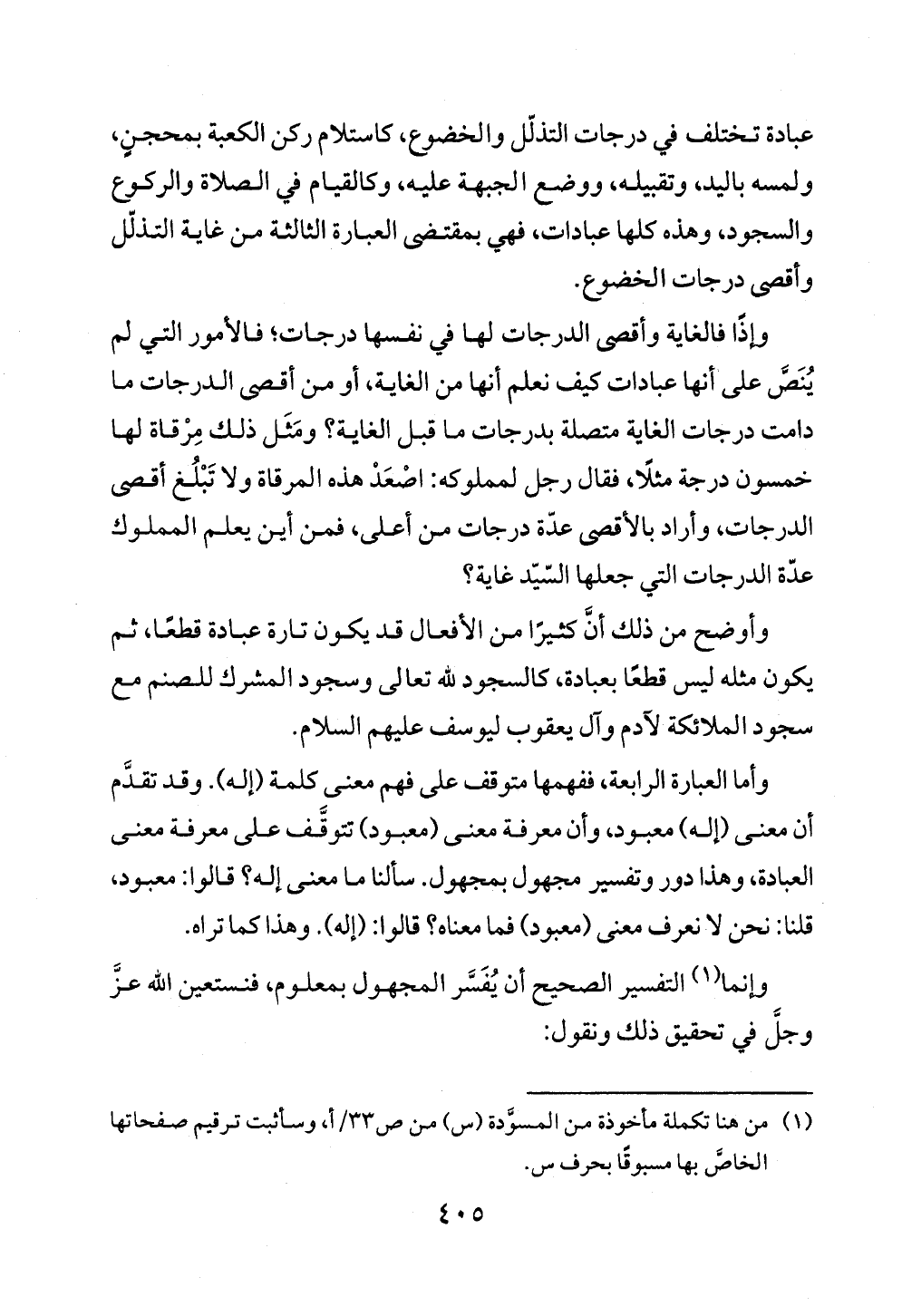 وأما العبارة الرابعة, ففهمها متوقف على فهم معنى كلمة (إله). وقد تقدَّم أن معنى (إله) معبود، وأن معرفة معنى (معبود) تتوقَّف على معرفة معنى العبادة، وهذا دور وتفسير مجهول بمجهول. سألنا ما معنى إله؟ قالوا: معبود، قلنا: نحن لا نعرف معنى (معبود) فما معناه؟ قالوا: (إله). وهذا كما تراه.