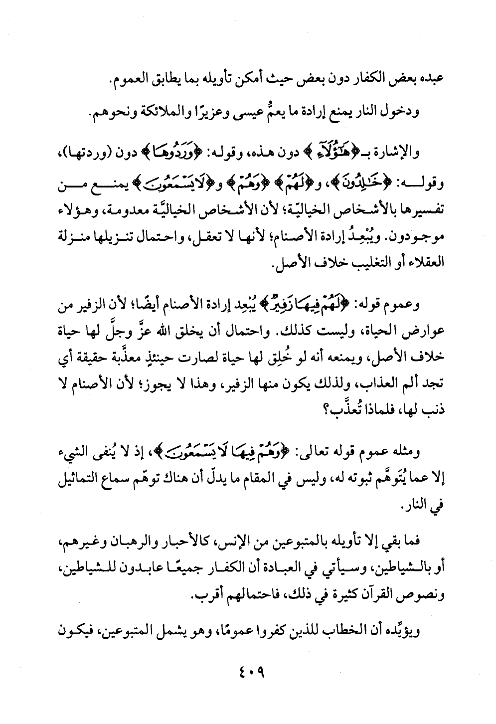 وعموم قوله: {لَهُمْ فِيهَا زَفِيرٌ} يُبْعِد إرادة الأصنام أيضًا؛ لأن الزفير من عوارض الحياة، وليست كذلك. واحتمال أن يخلق الله عزَّ وجلَّ لها حياة خلاف الأصل، ويمنعه أنه لو خُلِق لها حياة لصارت حينئذٍ معذَّبة حقيقة أي تجد ألم العذاب، ولذلك يكون منها الزفير، وهذا لا يجوز؛ لأن الأصنام لا ذنب لها، فلماذا تُعذَّب؟