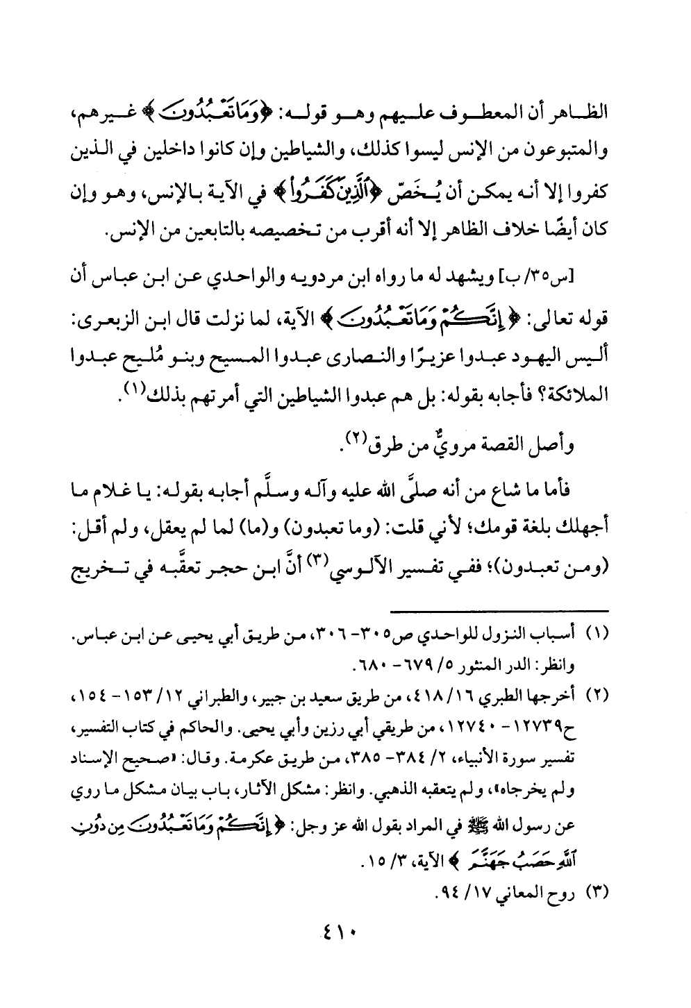 (¬٢) أخرجها الطبري ١٦/ ٤١٨، من طريق سعيد بن جبير، والطبراني ١٢/ ١٥٣ - ١٥٤، ح ١٢٧٣٩ - ١٢٧٤٠، من طريقي أبي رزين وأبي يحيى. والحاكم في كتاب التفسير، تفسير سورة الأنبياء، ٢/ ٣٨٤ - ٣٨٥، من طريق عكرمة. وقال: "صحيح الإسناد ولم يخرجاه"، ولم يتعقبه الذهبي. وانظر: مشكل الآثار، باب بيان مشكل ما روي عن رسول الله - صلى الله عليه وسلم - في المراد بقول الله عز وجل: {إِنَّكُمْ وَمَا تَعْبُدُونَ مِنْ دُونِ اللَّهِ حَصَبُ جَهَنَّمَ} الآية، ٣/ ١٥.