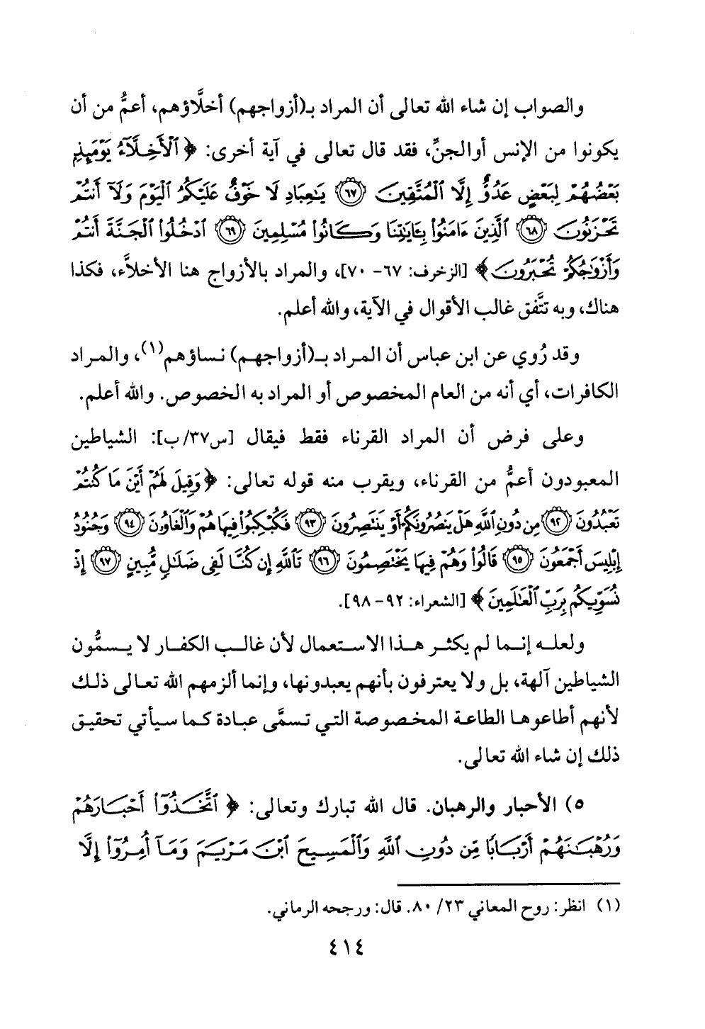 وعلى فرض أن المراد القرناء فقط فيقال [س ٣٧/ب]: الشياطين المعبودون أعمُّ من القرناء، ويقرب منه قوله تعالى: {وَقِيلَ لَهُمْ أَيْنَ مَا كُنْتُمْ تَعْبُدُونَ (٩٢) مِنْ دُونِ اللَّهِ هَلْ يَنْصُرُونَكُمْ أَوْ يَنْتَصِرُونَ (٩٣) فَكُبْكِبُوا فِيهَا هُمْ وَالْغَاوُونَ (٩٤) وَجُنُودُ إِبْلِيسَ أَجْمَعُونَ (٩٥) قَالُوا وَهُمْ فِيهَا يَخْتَصِمُونَ (٩٦) تَاللَّهِ إِنْ كُنَّا لَفِي ضَلَالٍ مُبِينٍ (٩٧) إِذْ نُسَوِّيكُمْ بِرَبِّ الْعَالَمِينَ} [الشعراء: ٩٢ - ٩٨].