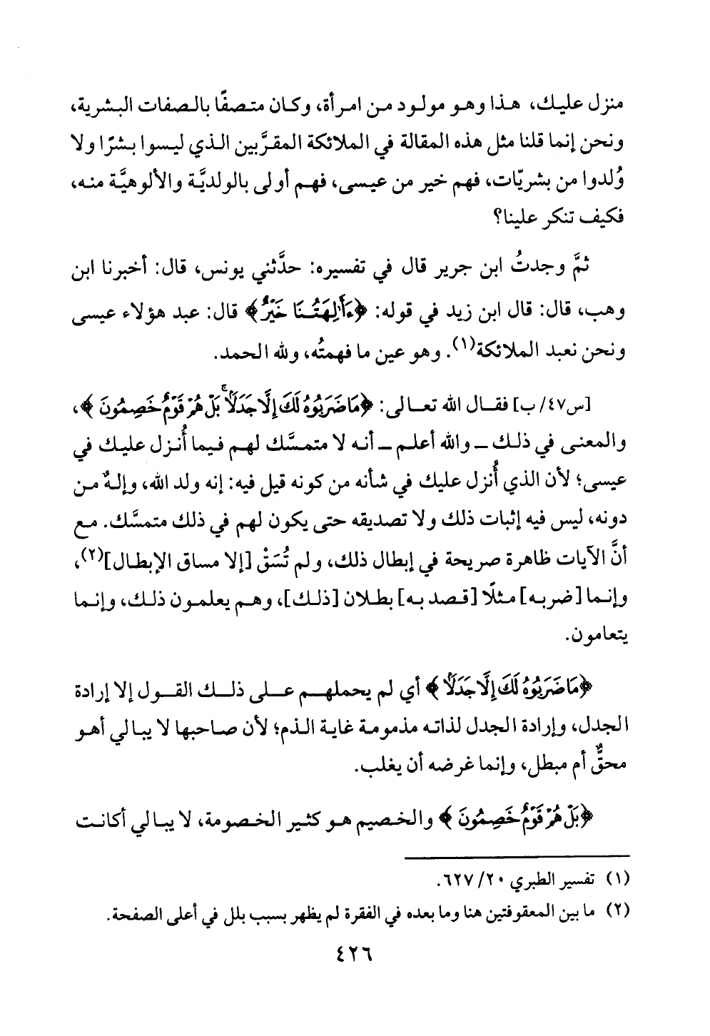 ثمَّ وجدتُ ابن جرير قال في تفسيره: حدَّثني يونس، قال: أخبرنا ابن وهب، قال: قال ابن زيد في قوله: {أَآلِهَتُنَا خَيْرٌ} قال: عبد هؤلاء عيسى ونحن نعبد الملائكة (¬١). وهو عين ما فهمتُه، ولله الحمد.