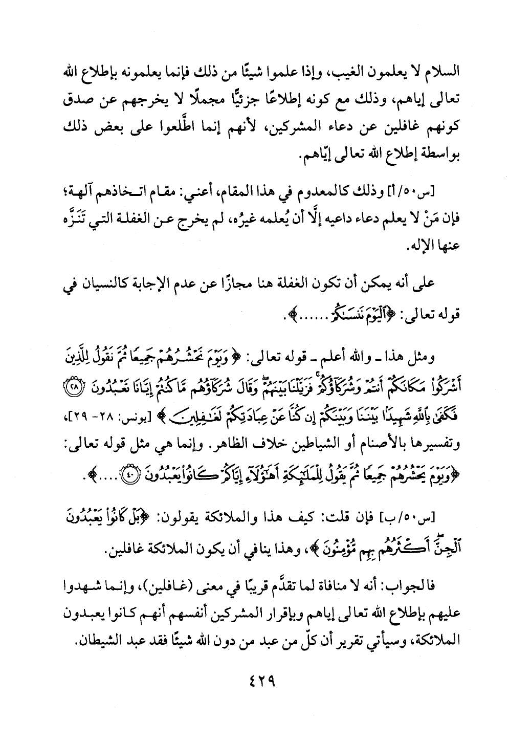 ومثل هذا ــ والله أعلم ــ قوله تعالى: {وَيَوْمَ نَحْشُرُهُمْ جَمِيعًا ثُمَّ نَقُولُ لِلَّذِينَ أَشْرَكُوا مَكَانَكُمْ أَنْتُمْ وَشُرَكَاؤُكُمْ فَزَيَّلْنَا بَيْنَهُمْ وَقَالَ شُرَكَاؤُهُمْ مَا كُنْتُمْ إِيَّانَا تَعْبُدُونَ (٢٨) فَكَفَى بِاللَّهِ شَهِيدًا بَيْنَنَا وَبَيْنَكُمْ إِنْ كُنَّا عَنْ عِبَادَتِكُمْ لَغَافِلِينَ} [يونس: ٢٨ - ٢٩]، وتفسيرها بالأصنام أو الشياطين خلاف الظاهر. وإنما هي مثل قوله تعالى: {وَيَوْمَ يَحْشُرُهُمْ جَمِيعًا ثُمَّ يَقُولُ لِلْمَلَائِكَةِ أَهَؤُلَاءِ إِيَّاكُمْ كَانُوا يَعْبُدُونَ (٤٠) .... }.